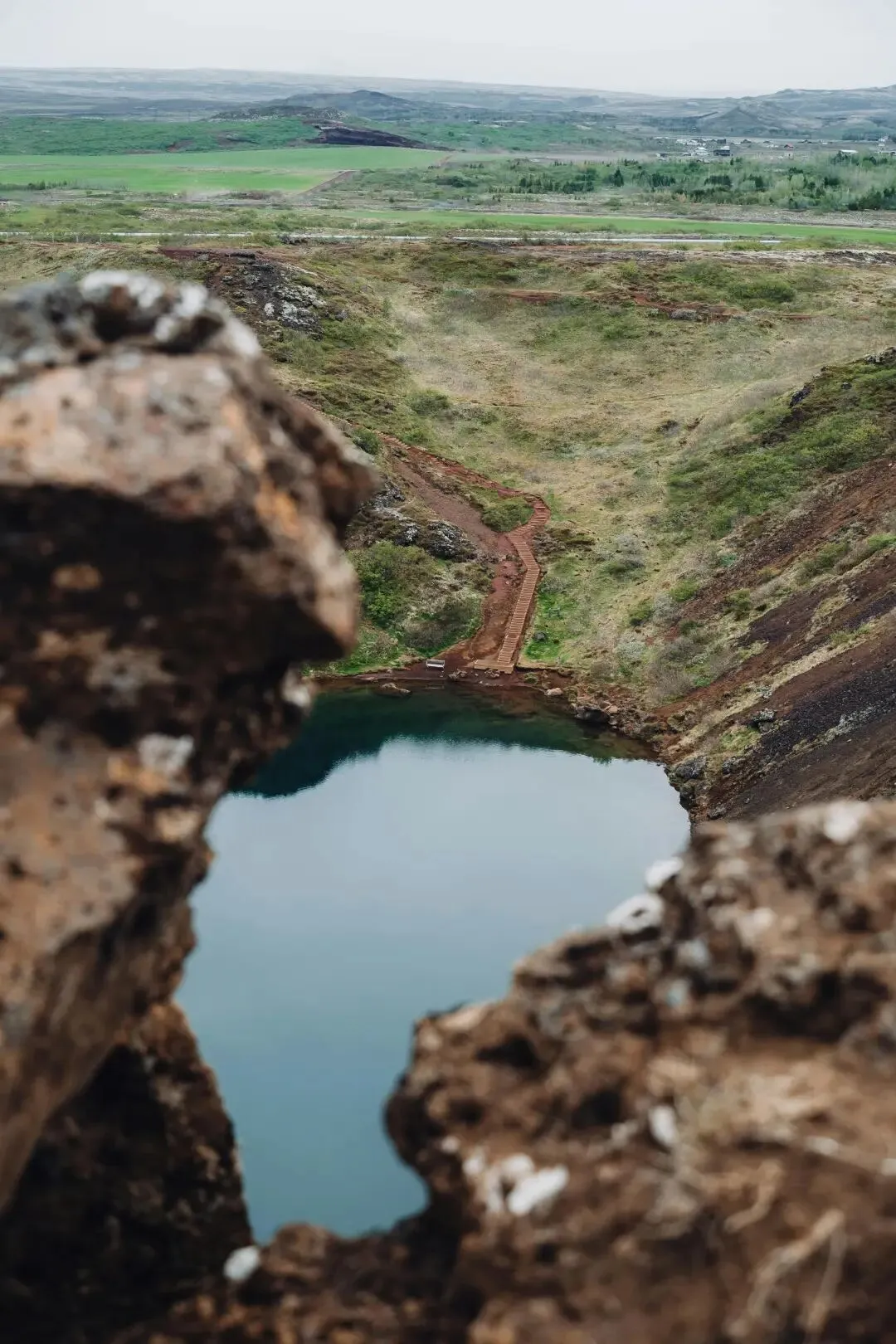 沿着一号公路往东走,你会路过一座六千五百万年前的火山遗址。如今火山口里盛着一潭清水,矿物质让湖水随着光线变换颜色,有时绿,有时蓝,有时灰。