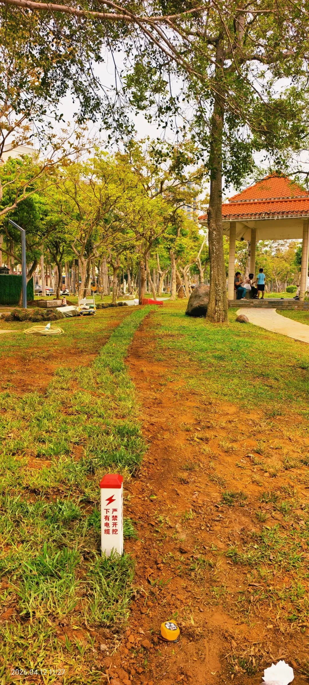 大树底下,旅客在乘凉,唱歌,旁边还有园林绿化工人,在做着新的草皮种植。