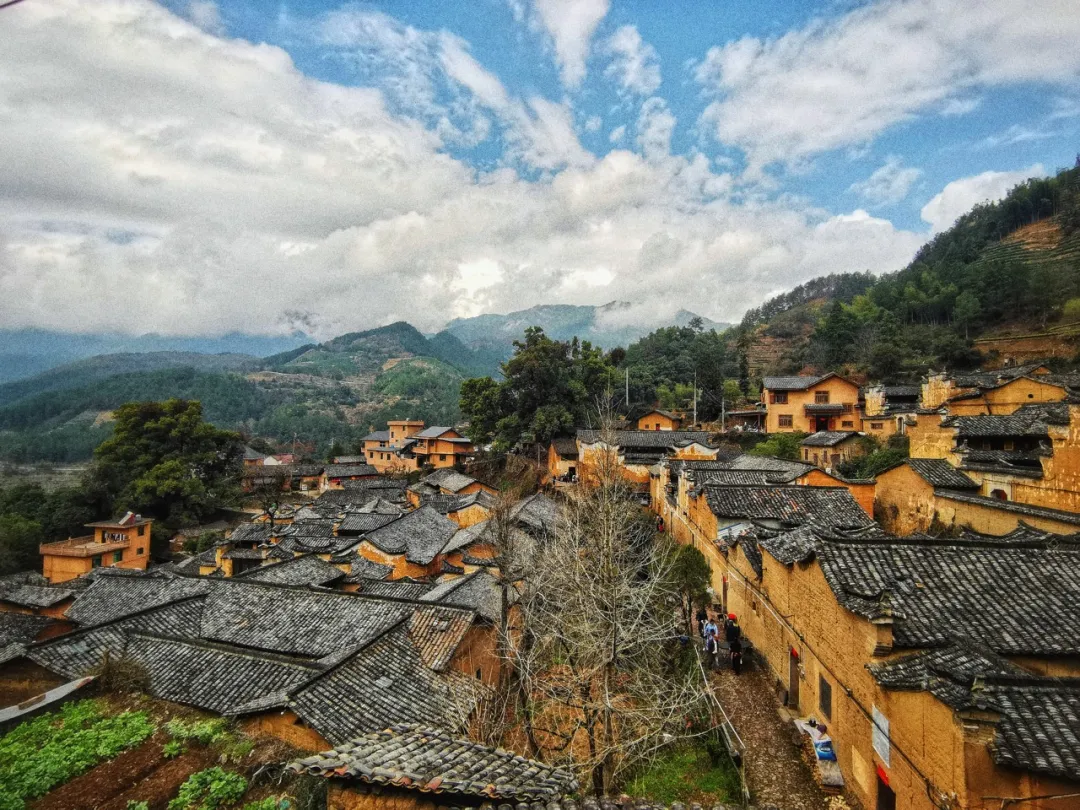 这个名字可不是白叫的!黄墙黑瓦的老屋依山而建,层层叠叠像一座金色宫殿。