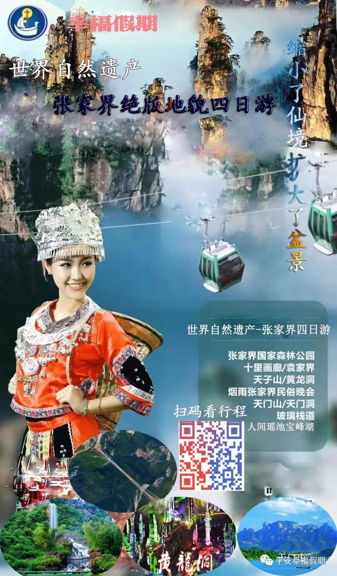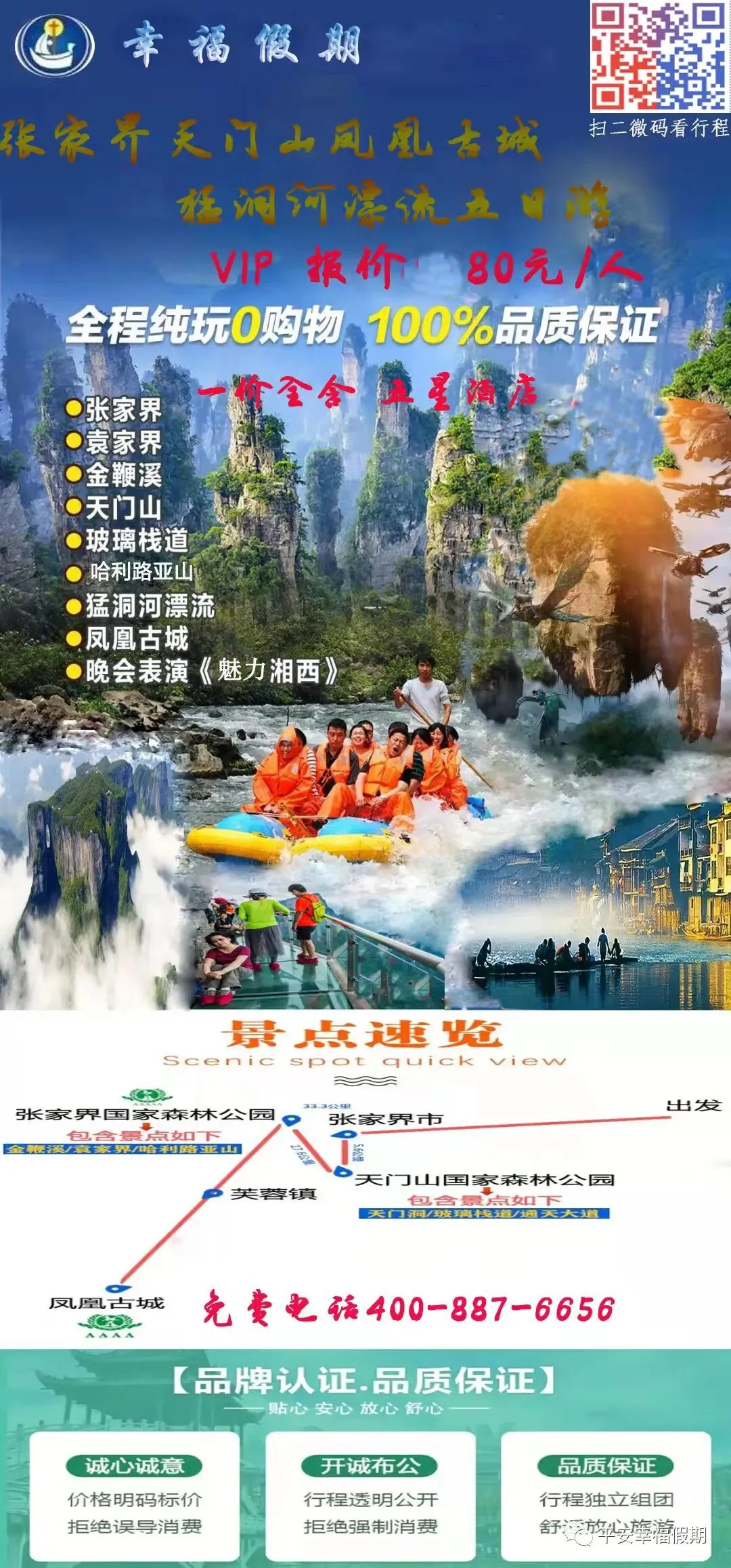“幸福假期”旅行私人订制:根据客人来的时间、文化需求、审美标准、消费能力、体力状况、天气情况等量身定制(一分钱一分货,绝对超值) 理念:游客至上、安全第一、诚信为首、快乐始终、纯玩到底! 优势:专业操作、独家路线、特色旅行、口碑经营。选择“哈利路亚假期”,是聪明的您实现快乐旅行的开始!24小时全球免费电话:400-887-6656 张先生15874452377(微信) 13574481551(微信) 看张家界最漂亮、最震撼、最勾魂风景,就选择“幸福假期”!您不用做攻略,不用费神,不用担心看不到最美的风景,只需告知身份证号、来的时间、人数、游玩天数,然后就开心玩吧!