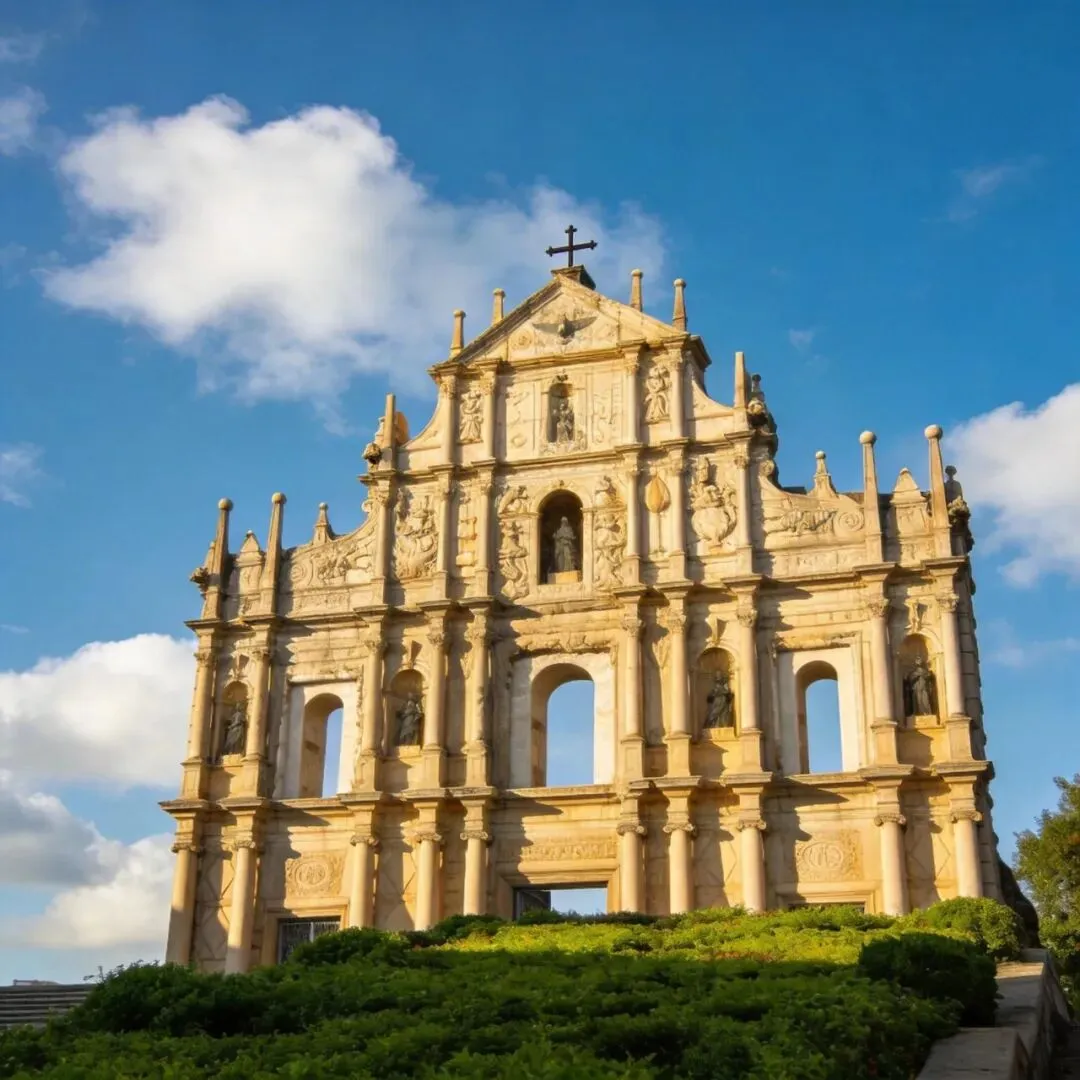 过关后从拱北口岸坐新葡京免费发财车,先打卡新葡京酒店金色莲花建筑,然后步行10分钟到大三巴牌坊。这是澳门的地标性建筑,原为圣保禄教堂前壁,1835年大火后仅剩这道巴洛克式石砌牌坊,浮雕上的圣经故事与中式祥云巧妙融合。建议9点前到避开人流,旁边的恋爱巷彩色小巷拍照超美,再顺路去议事亭前地看葡式波浪碎石广场,玫瑰圣母堂鹅黄建筑很出片。别忘了去附近吃猪扒包、牛杂、碗仔翅等澳门特色小吃当早餐!
