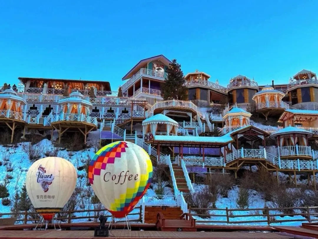 童话风打卡:蓝白欧式木屋搭配雪山背景,随手一拍就是朋友圈爆款,热气球、特色打卡装置,分分钟拍出北欧风大片。