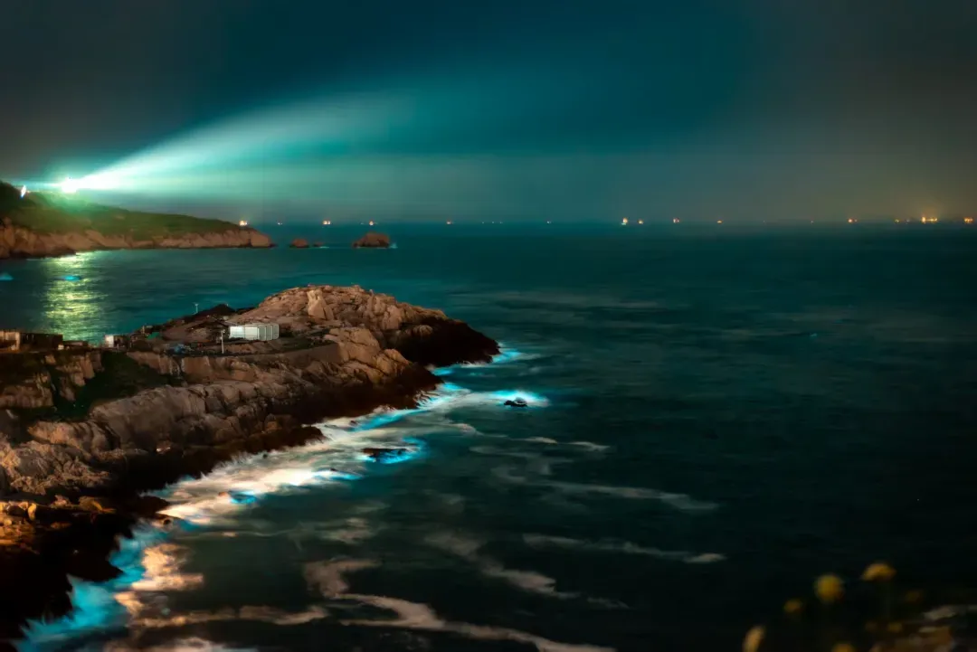 每年第一场蓝眼泪总是格外让人期待。春日的风吹至海岸线,白墙蓝顶的渔村醒了过来,路旁的野花悄悄冒了芽,百年灯塔依旧守着东海的日出日落,海边的民宿亮起了暖黄的灯……