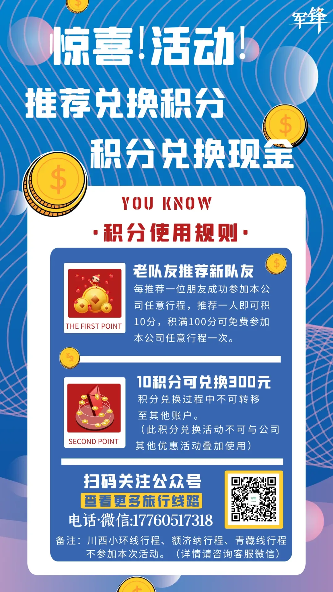 积满100分可免费参加本公司任意行程一次