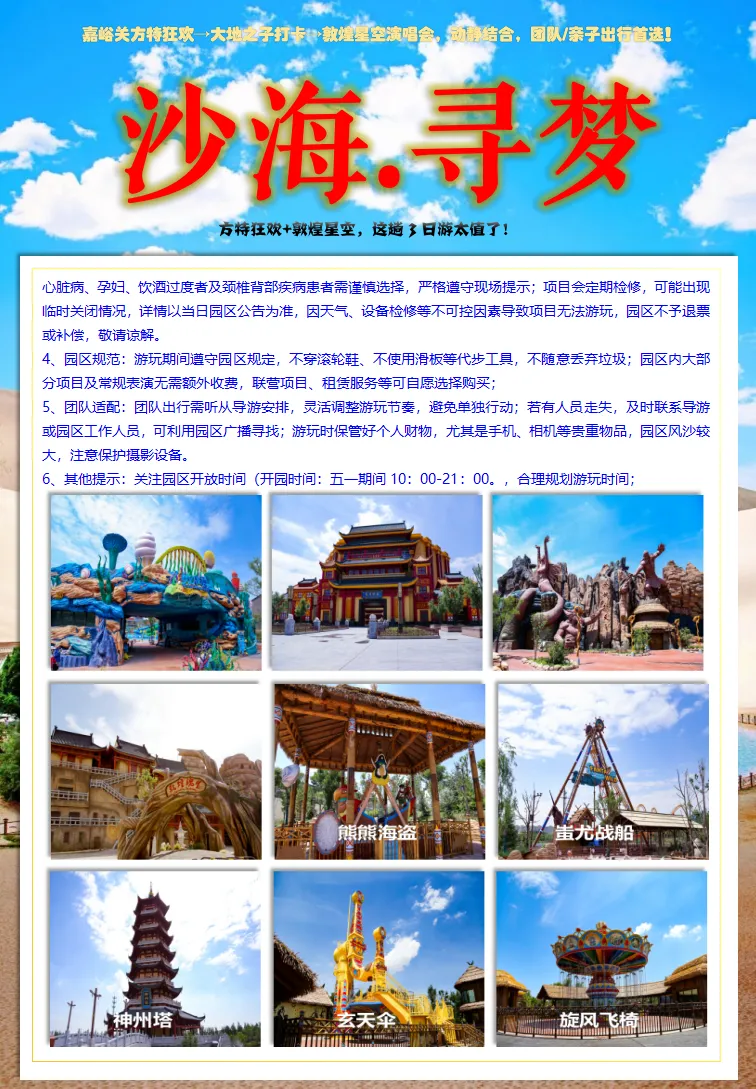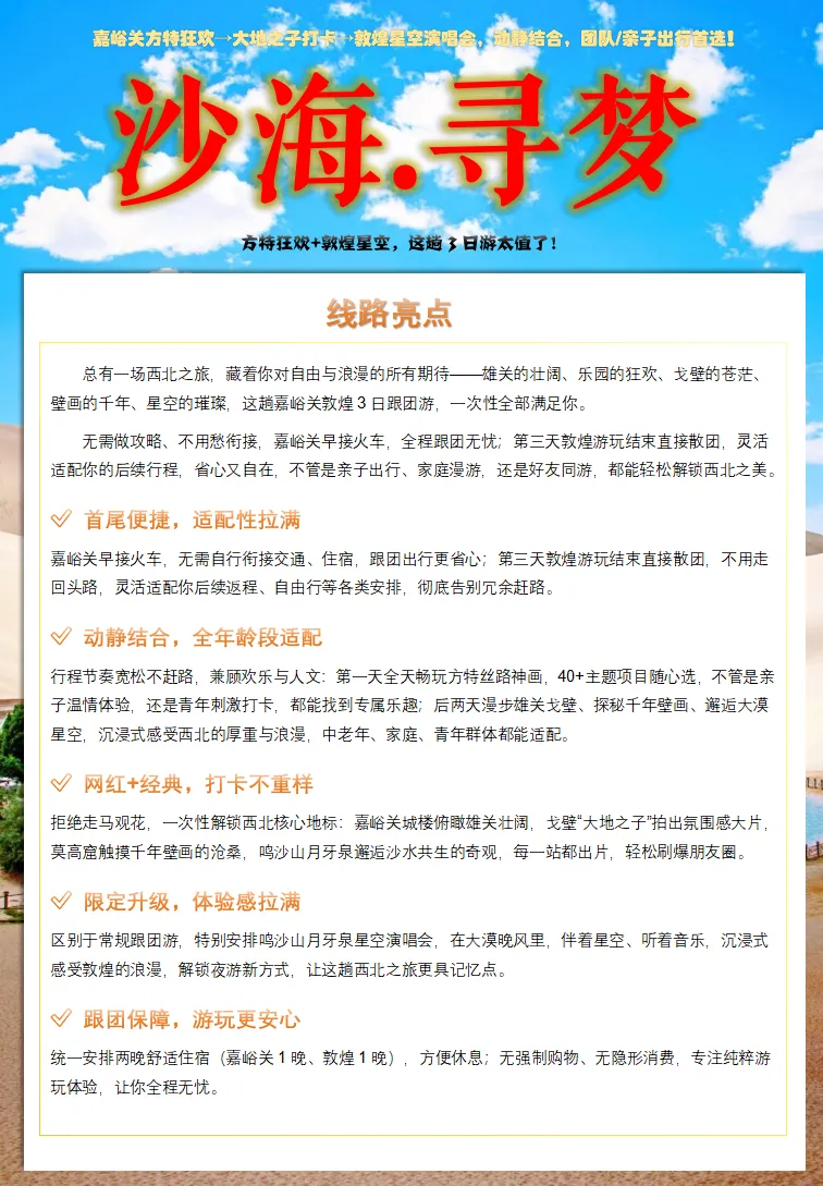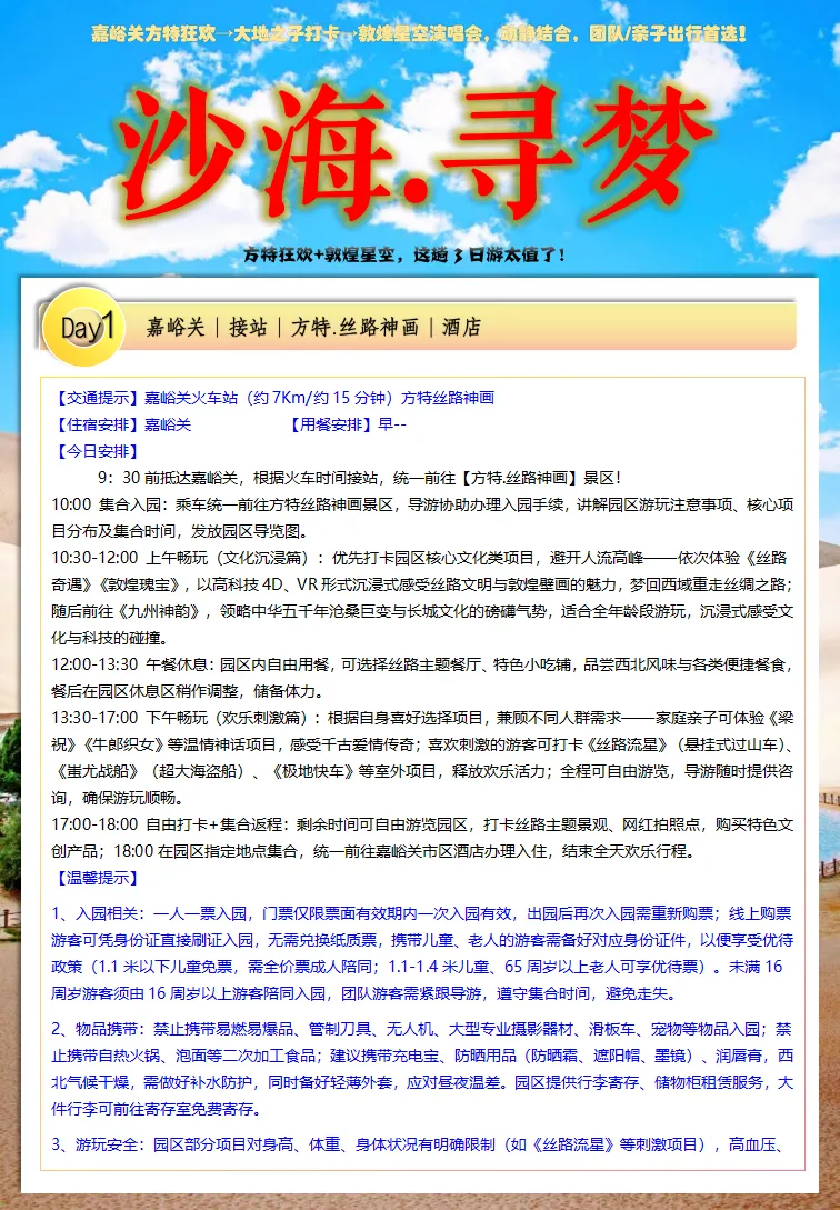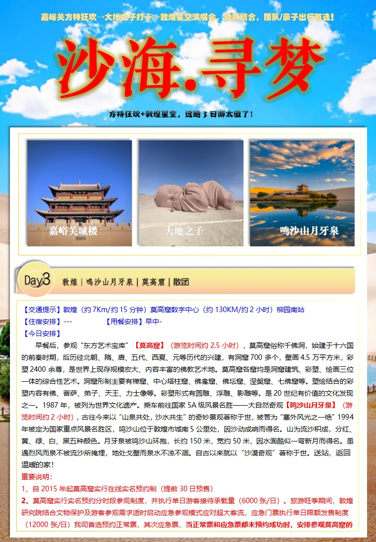 雄关漫道,沙海寻梦:嘉峪关到敦煌3 天2 晚旅游攻略(方特丝路神画+嘉峪关城楼+大地之子+ 鸣沙山月牙泉+ 莫高窟)跟团游.天天发团.一人也可拼团