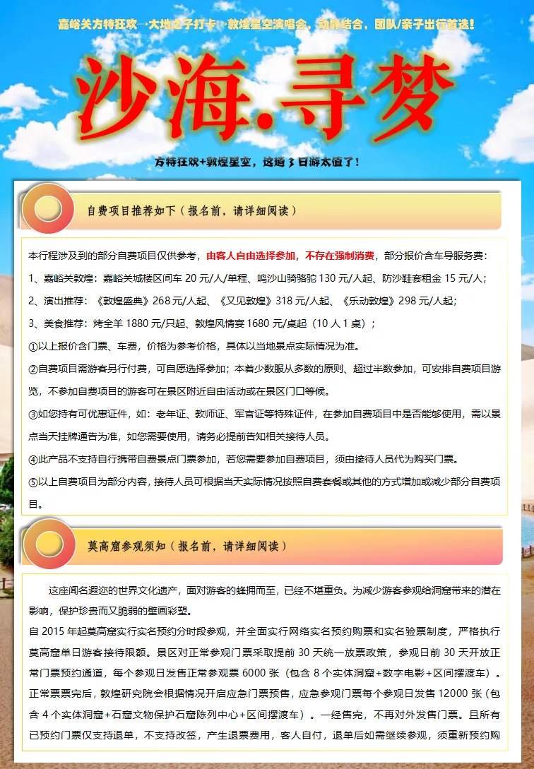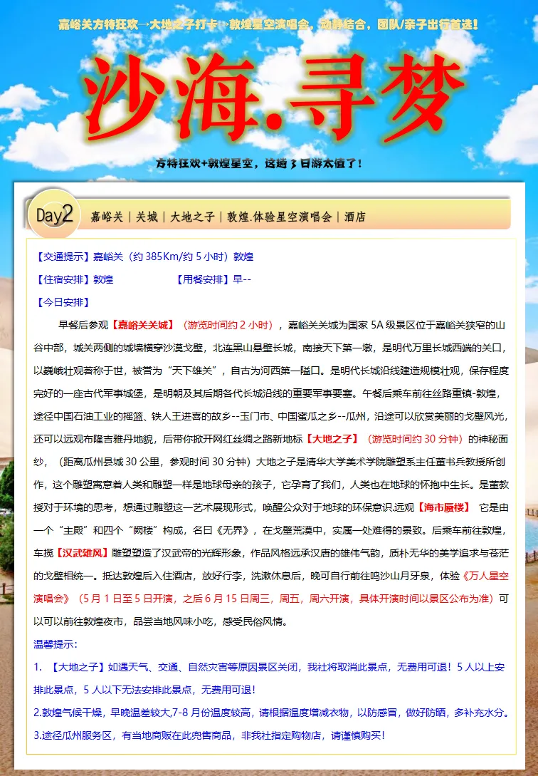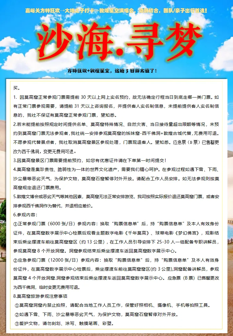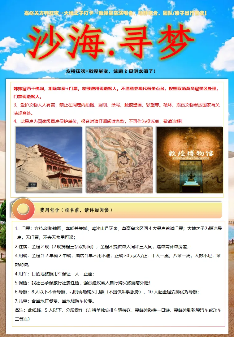 ②5人以下,此行程分段操作,嘉峪关散拼一日游,敦煌拼一日游,嘉峪关敦煌区间动车二等座或城际大巴或旅游车。