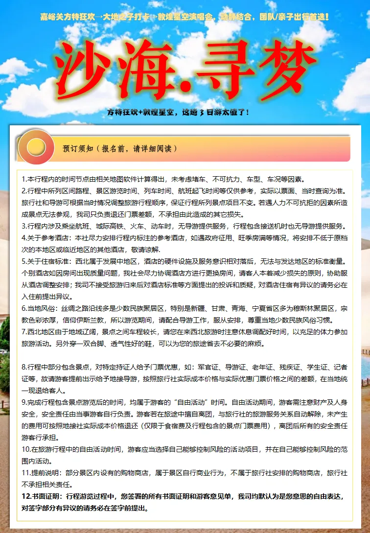 ③行程第二天,从嘉峪关到敦煌途中,观大地之子,远观无界与车揽汉帝雄风,此三个景点为赠送景点5人以下不安排此景点,也无费用可退,特此说明。敬请谅解。