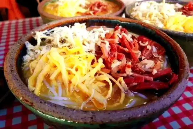 4.️会理鸡火丝:火腿丝和鸡丝铜锅煮,配饵块,汤鲜。