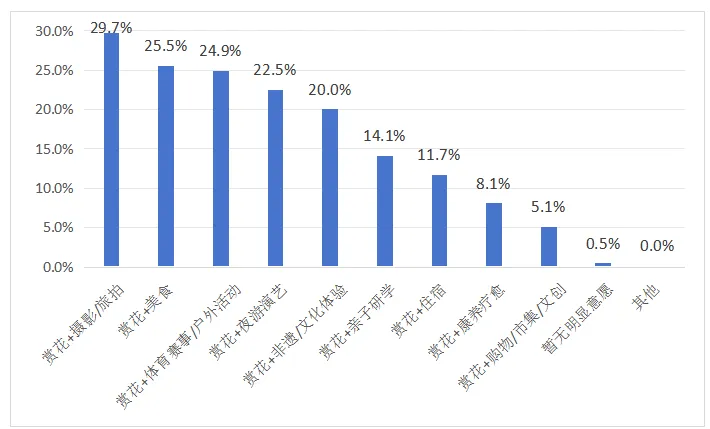 跨区域赏花线路开始涌现。湖北以“相约春天赏樱花”为统一品牌,在全省统筹295家核心景区,密集推出400场赏花主题活动,并通过省级平台同步发布推荐榜单和多客群精品线路,将原本分散于武汉、襄阳、宜昌等地的花景资源整合为具有全国声量和国际影响力的省域赏花矩阵。汉中则将油菜花资源由若干观花点扩展为251公里花海廊道,并配套15条精品观花线路、专线交通和“一图游”产品,把零散花景串联为可移动、可停留、可消费的区域产品。北京在2026年京津冀全民赏花季中推出三地联动赏花地图和跨区域游线,进一步推动赏花游从“本地看花”走向“区域串联”。赏花游的竞争边界正在从单一景区扩展到城市群协同、旅游大廊道规划和省域营销整合。情绪疗愈和社交传播成为主要动机。专项调研显示,42.2%的受访者将“拍照出片、记录分享”置于赏花游动机首位,高于“欣赏花卉美景、感受自然季节变化”(41.8%)和“参加赏花节庆、感受热闹氛围”(27.4%)。这意味着,决定游客停留时长和消费转化的,已不只是能否看到花,更在于能否在场景中完成情绪疗愈、身份表达和社交传播。谁能够提供更高的出片率、更稳定的氛围感和更易触发分享的话题点,谁就更容易在社交媒体时代形成二次扩散。2026年樱花节期间,无锡鼋头渚通过增加樱花品种、延展湖岸游线,并叠加AR漫游、光影音乐会、主题游船和夜樱演艺,将传统白天赏樱升级为全天候情绪消费场,游客停留时长明显延长,二次消费比重持续提高。多元化、多层次市场特征日益明显。赏花游正在摆脱“只是年轻人拍照打卡”的单一印象,形成覆盖青年、中年到银发人群的广谱市场。不同年龄客群的需求逻辑并不相同,18—24岁受访者更偏好妆造打卡、时尚专场和数字化表达,25—45岁群体则更关注夜游演艺、组合产品、联票套餐以及天气和客流预警。收入水平同样影响赏花行为,无固定收入群体以“本地公园/城市绿地赏花”为主,占比达到52.0%;2001—5000元群体已明显向周边乡村赏花和周边城市微度假扩展;8001—12000元群体中,“周边城市赏花微度假”占比进一步升至36.0%;高收入人群则更倾向于深度游和跨省“追花”。赏花目的地继续呈现多元化发展,覆盖全国各地。平台数据显示,2026年春季赏花游十大热门目的地分别是:武汉(东湖樱花园/武汉大学·樱花)、婺源(江岭/ 篁岭·油菜花)、无锡(鼋头渚·樱花)、贵阳(贵安万亩樱花园·樱花)、洛阳(王城公园·牡丹)、平谷(多地·桃花)、昆明(教场北路·蓝花楹)、林芝(波密·桃花)、曲靖(罗平·油菜花)、上海(顾村公园·樱花)。“赏花+”玩法更受游客欢迎。对游客“赏花+”复合型消费产品购买意愿的调查显示,最受欢迎的是“赏花+摄影/旅拍”,占比29.7%;其次是美食、体育赛事/户外活动、夜游演艺和非遗/文化体验。这表明,游客愿意为花景买单,但更愿意为花景之上的内容和体验支付溢价。湖北花博汇将郁金香花海与花神巡游、飞花令、非遗火秀铁花等内容结合,形成“日夜双景+沉浸赏花”的体验模式;广州海珠湿地以宫粉紫荆花道为基础举办花朝节,嵌入十二花神和国风NPC互动,将自然湿地转化为国风沉浸场域。未来决定“赏花+”产业能否发展壮大的关键,不在于简单做加法,而在于不同场景之间能否形成完整的体验闭环和消费闭环。从现有案例看,樱花、油菜花和牡丹已经分别形成了城市节会型、乡村廊道型和文化IP型三类较为成熟的开发模式。对目的地而言,真正需要思考的不是种什么花最热,而是围绕何种花景资源形成何种产品逻辑和消费结构。交文旅深度融合提升赏花体验。当游客越来越重视出行效率、游览组织和综合体验,赏花经济也要从“看花”转向“赏花+交通+消费”。今年春季,多地围绕花事活动同步优化交通接驳和文旅场景。洛阳在牡丹文化节期间强化节会活动与城市消费联动,打造沉浸式文旅新场景;长沙推出“地铁+公交”春游专线,直达赏樱点和热门打卡地,减少换乘成本;北京依托S2线“开往春天的列车”,把花海景观、长城游览和周边休闲资源串联起来。交通不再只是配套保障,而是赏花产品的重要组成部分。通过专线接驳、轨道联动和主题线路建设等方式,让游客进得来、游得顺、留得下,既提升了赏花便利度和参与感,也带动了沿线餐饮、文创、休闲等消费增长。农文旅融合提升综合效益。乡村是赏花游的重要场景。赏花游高质量发展的关键,不在于花期带来多少短时客流,而在于能否将流量转化为乡村长期收益。江西婺源篁岭景区较为完整地展示了“农文旅”融合路径:围绕油菜花开发精油、花茶、菜籽油等深加工产品,在游览沿线布局沉浸式徽州农耕市集、古法榨油体验和高品质乡村民宿,推动游客消费从门票和观景延伸到农产品销售、手作体验、餐饮和住宿等本地产业环节。如果说花海负责把游客带到乡村,那么花食、花饮、花材加工、农耕体验和乡村住宿等业态才是价值沉淀的关键。只有推动多元业态协同发展,才能让赏花经济从季节性热闹走向可持续增收。体旅融合丰富赏花业态。赏花游进一步由静态看花转向动态参与,从季节性观景活动转向更契合健康生活方式的运动休闲。专项调查显示,对“花田徒步、骑行等运动体验”表现出浓厚兴趣的比例达到27.4%,愿意为“赏花+体育赛事/户外活动”付费的受访者占