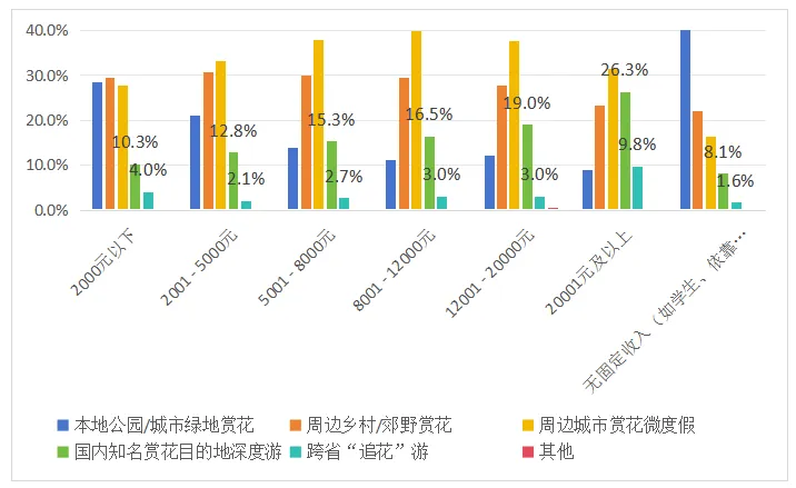 赏花消费结构持续优化。赏花游消费能级持续提升,正在从低门槛看景向高品质停留转变。专项调研显示,2025年赏花游中人均消费500元及以下的占比为45.8%,到2026年降至44.2%;与之对应,501—1000元区间占比则由39.9%上升至43.6%,提高了3.7个百分点。拉动客单价上升的,不是单纯扩大花景规模,而是围绕花景构建更完整的体验链条。重庆多地通过花田火锅、乡村民宿、空中赏花等新场景延伸“赏花经济”消费链条。在江津区蔡家镇猫山樱博园,7000亩樱花竞相绽放,今年2月开园以来已接待游客近15万人次,销售收入同比增长10%。只要停留体验足够丰富,花景就能够转化为更高质量的消费场景。赏花游出游半径明显拉长。赏花游由城市内部延伸至近郊和周边城市,乃至远程目的地。专项调研显示,在赏花目的地空间选择上,“周边城市赏花微度假”以36.6%的比例居首,“周边乡村/郊野赏花”占29.6%,次之,明显高于“本地公园/城市绿地赏花”的15.6%。“国内知名赏花目的地深度游”占15.3%,表明长线市场也在稳定增长当中。其中,高收入群体的长线化特征更加突出,月收入20001元及以上群体中,选择“国内知名赏花目的地深度游”和“跨省‘追花’游”的比例分别达到26.3%和9.8%。图1 不同收入群体的赏花出游方式偏好