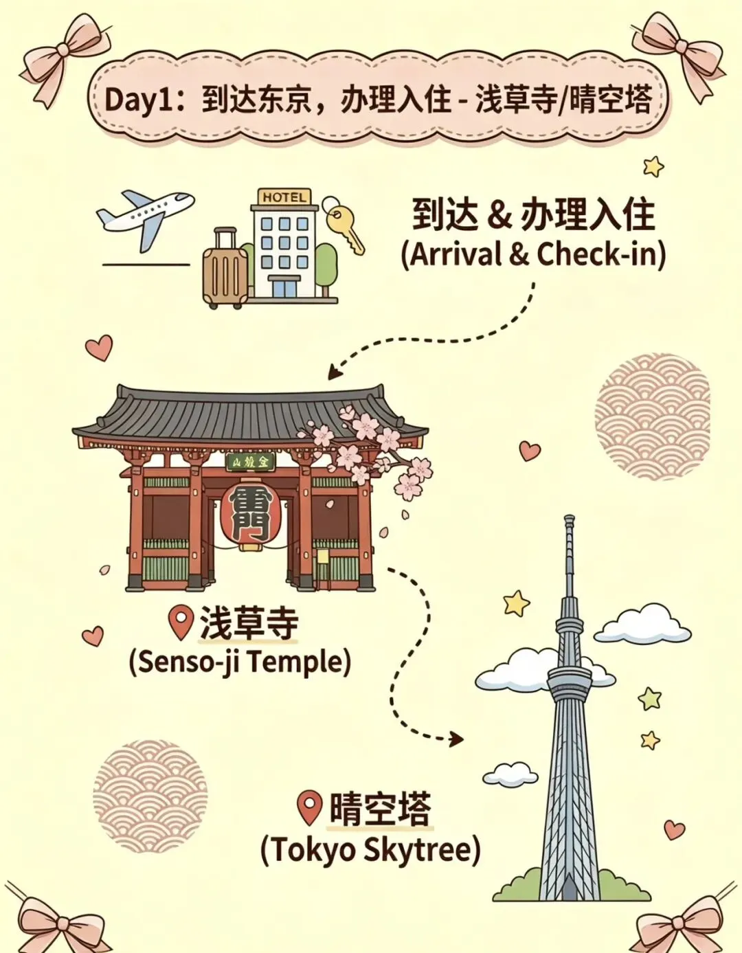 · 抵达东京后先办理酒店入住。· 下午游览浅草寺,感受江户风情,仲见世通商店街可买人形烧、雷门米饼。· 傍晚步行或乘电车前往东京晴空塔,登上展望台欣赏东京夜景,塔下商场“东京空町”适合晚餐和购物。