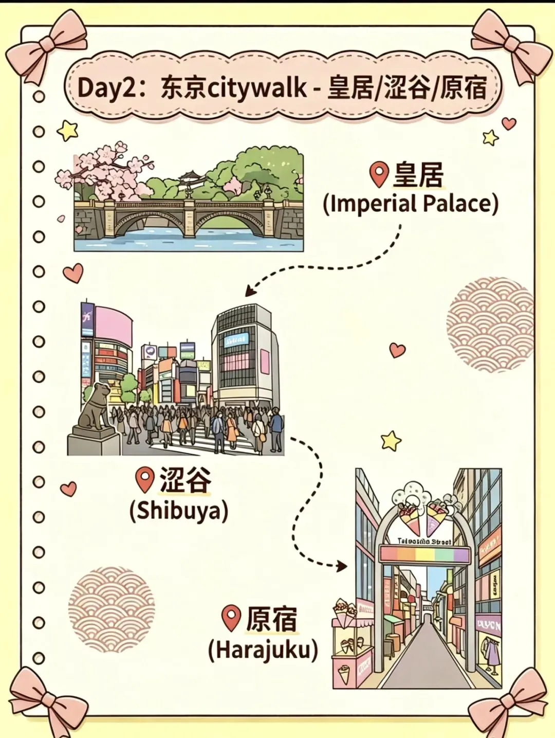 Day 2:东京Citywalk – 皇居 / 涩谷 / 原宿住宿:东京· 上午:皇居。参观皇居外苑、二重桥,可预约内苑导览(需提前官网申请)。· 下午:涩谷。打卡世界最繁忙的十字路口、忠犬八公像,逛SHIBUYA SKY、涩谷109。· 傍晚:原宿。走竹下通买可爱小物,表参道感受潮流建筑,适合年轻人拍照和吃可丽饼。