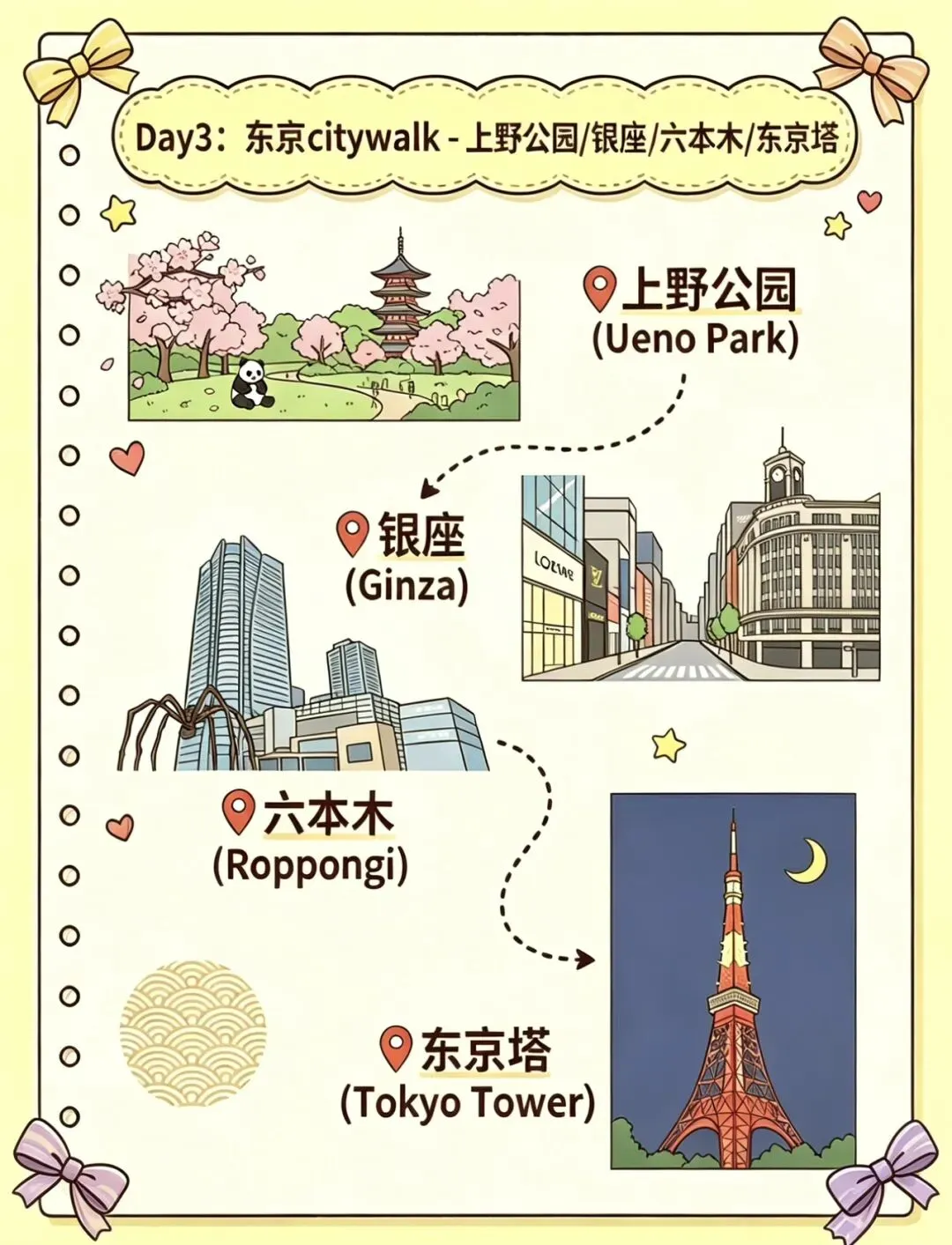 Day 3:东京Citywalk – 上野公园 / 银座 / 六本木 / 东京塔住宿:东京· 上午:上野公园。参观东京国立博物馆、上野动物园,或不进馆就在公园散步喂鸽子。· 中午:银座。高级购物区,可逛GINZA SIX、UNIQLO旗舰店,午餐尝试高级寿司或炸猪排。· 下午:六本木。登上六本木Hills展望台看东京塔与城市全景,顺便逛森美术馆。· 晚上:东京塔。近距离欣赏夜景,海贼王主题乐园已关闭,但塔下灯光很浪漫。
