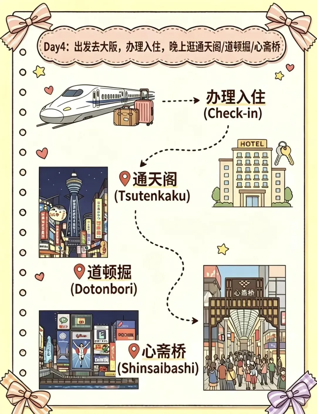 Day 4:出发去大阪 → 通天阁 / 道顿堀 / 心斋桥住宿:大阪· 上午乘坐新干线从东京到大阪(约2.5小时,约14,000日元)。· 下午办理入住后,前往通天阁。登上大阪老牌地标,吃串炸(注意酱汁不可回蘸)。· 傍晚:道顿堀。看格力高跑跑人招牌,尝章鱼烧、大阪烧、蟹道乐。· 晚上:心斋桥。沿河散步,逛药妆店、二手奢侈品店,筋堺商店街也很热闹。