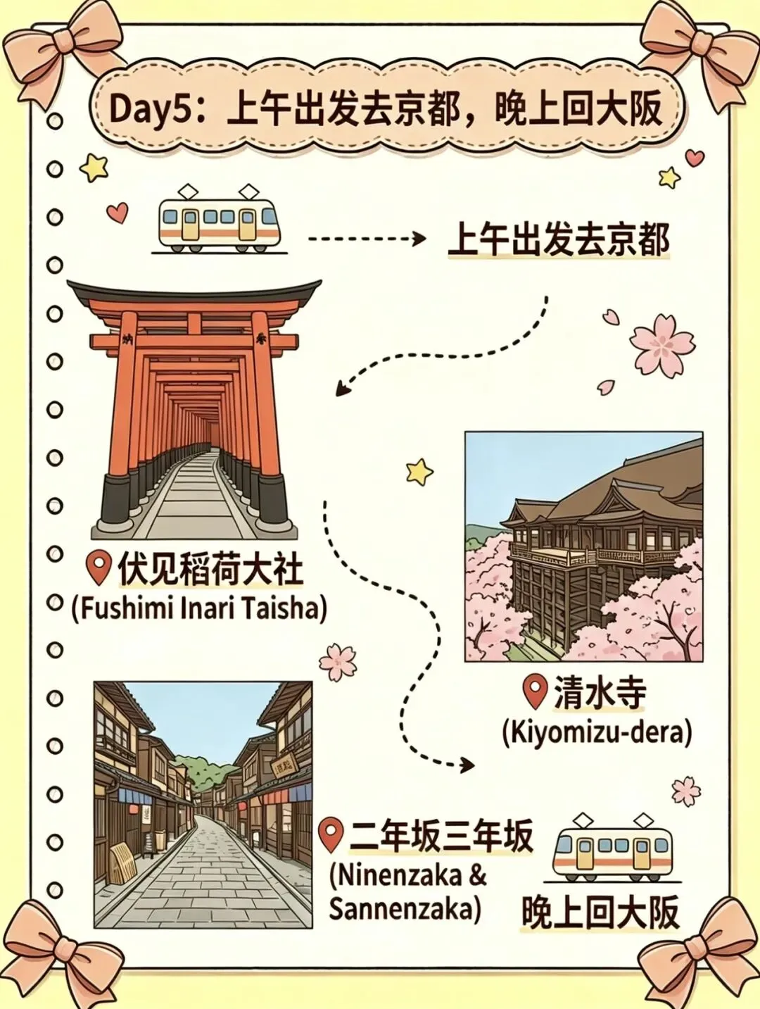Day 5:京都一日游(往返大阪)住宿:大阪· 上午乘JR或京阪电车至京都(约30-50分钟)。· 伏见稻荷大社:千本鸟居是必拍点,建议早去避开人潮。· 清水寺:从本堂舞台眺望京都全景,音羽瀑布排队喝水祈福。· 二三年坂:石板路两侧有传统町屋、陶器店、抹茶甜点,适合散步和买伴手礼。· 晚上返回大阪,京都一日往返虽然紧凑,但经典景点都能覆盖。