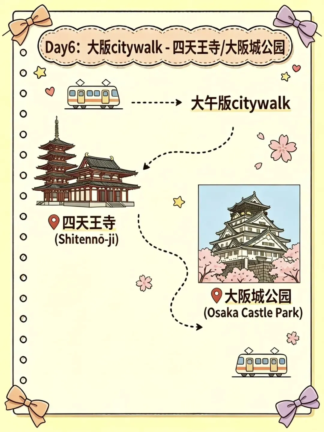 Day 6:大阪Citywalk – 四天王寺 / 大阪城公园住宿:大阪· 上午:四天王寺。大阪最古老的佛寺,中心伽蓝和五重塔很安静,适合慢走。· 下午:大阪城公园。登上天守阁了解丰臣秀吉历史,公园内可坐御座船游护城河。· 晚上可自由安排:再去心斋桥补货,或去梅田空中庭园看夜景。