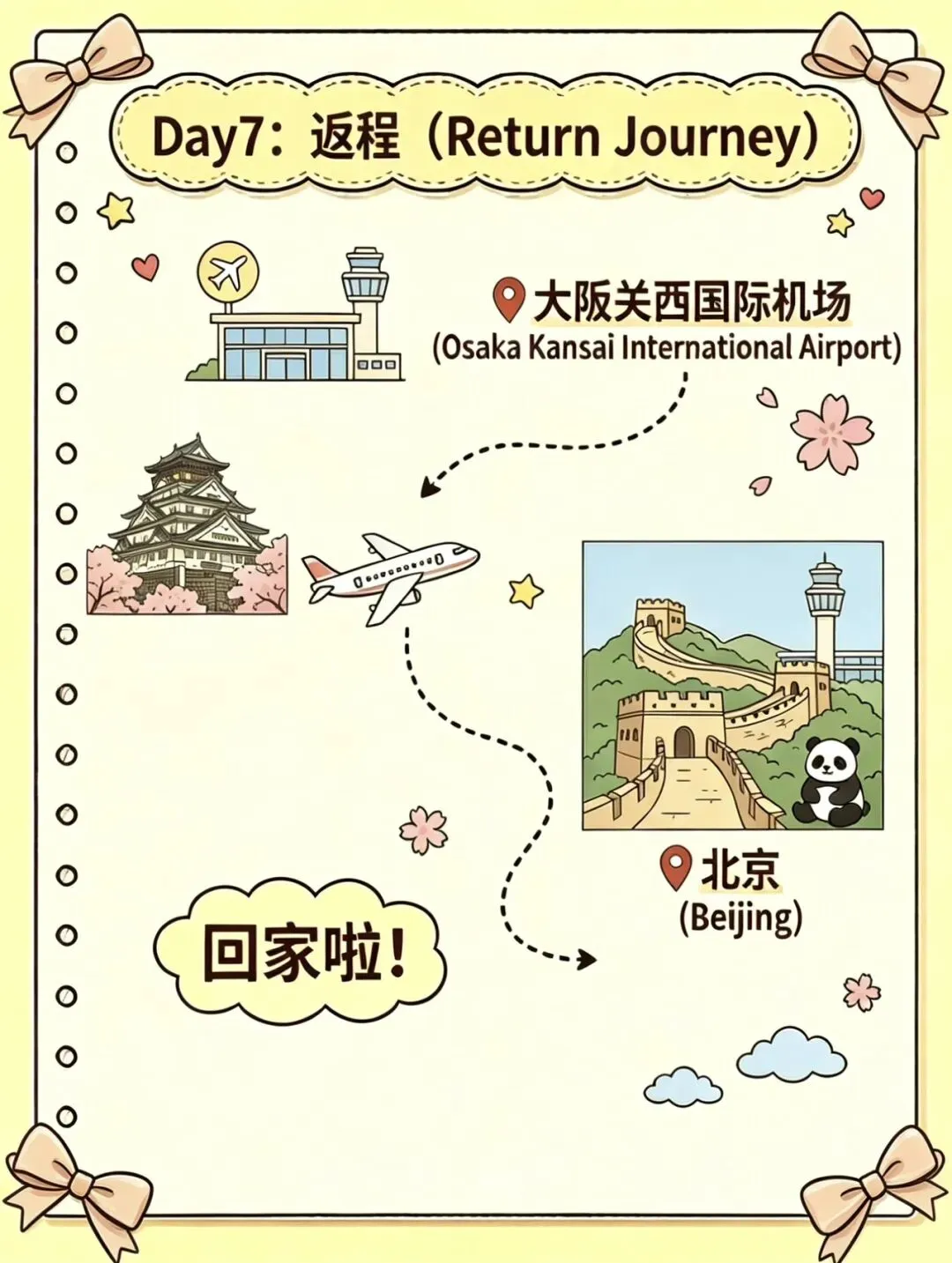 Day 7:返程 – 大阪关西国际机场 → 北京住宿:无· 上午根据航班时间前往关西机场,建议提前至少2小时到达。· 机场可买白色恋人、Royce巧克力、薯条三兄弟等伴手礼。· 结束特种兵式7天之旅,回家啦!必备物品 & 实用信息
