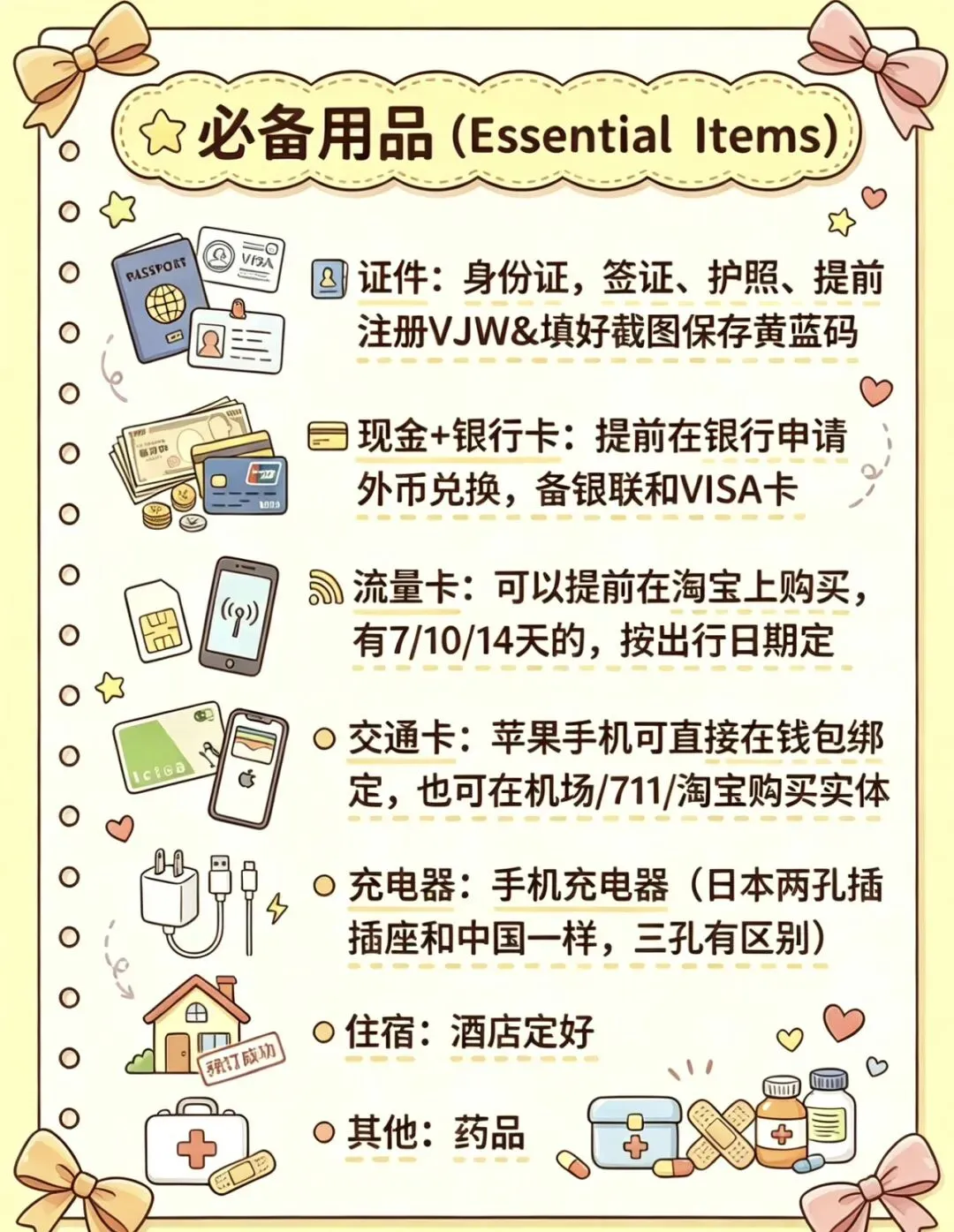 证件 & 资金· 身份证、护照、签证(提前办好)· 提前注册VJW(Visit Japan Web),保存黄码(检疫)和蓝码(海关)· 现金+银行卡:部分小店只收现金,建议换5-10万日元;备银联+VISA卡交通 & 网络