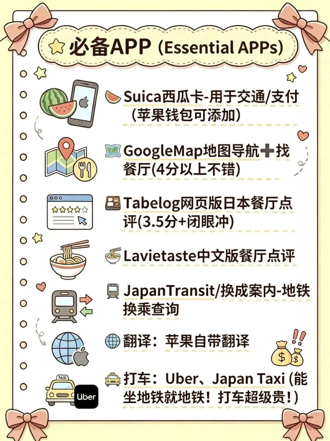 · 苹果手机:钱包直接添加Suica西瓜卡,充值方便· 淘宝提前买流量卡(7/10/14天可选)· 打车很贵,尽量地铁。必备APP:Google Maps(导航+找餐厅4分以上)、JapanTransit(换乘)、Uber/JapanTaxi(备用)住宿 & 其他· 酒店提前订好,东京住新宿/上野/浅草,大阪住心斋桥/难波/梅田附近更便利· 充电器:日本两孔插座和中国一样,三孔需转换头· 常用药(感冒药、肠胃药、创可贴)紧急电话(建议保存)