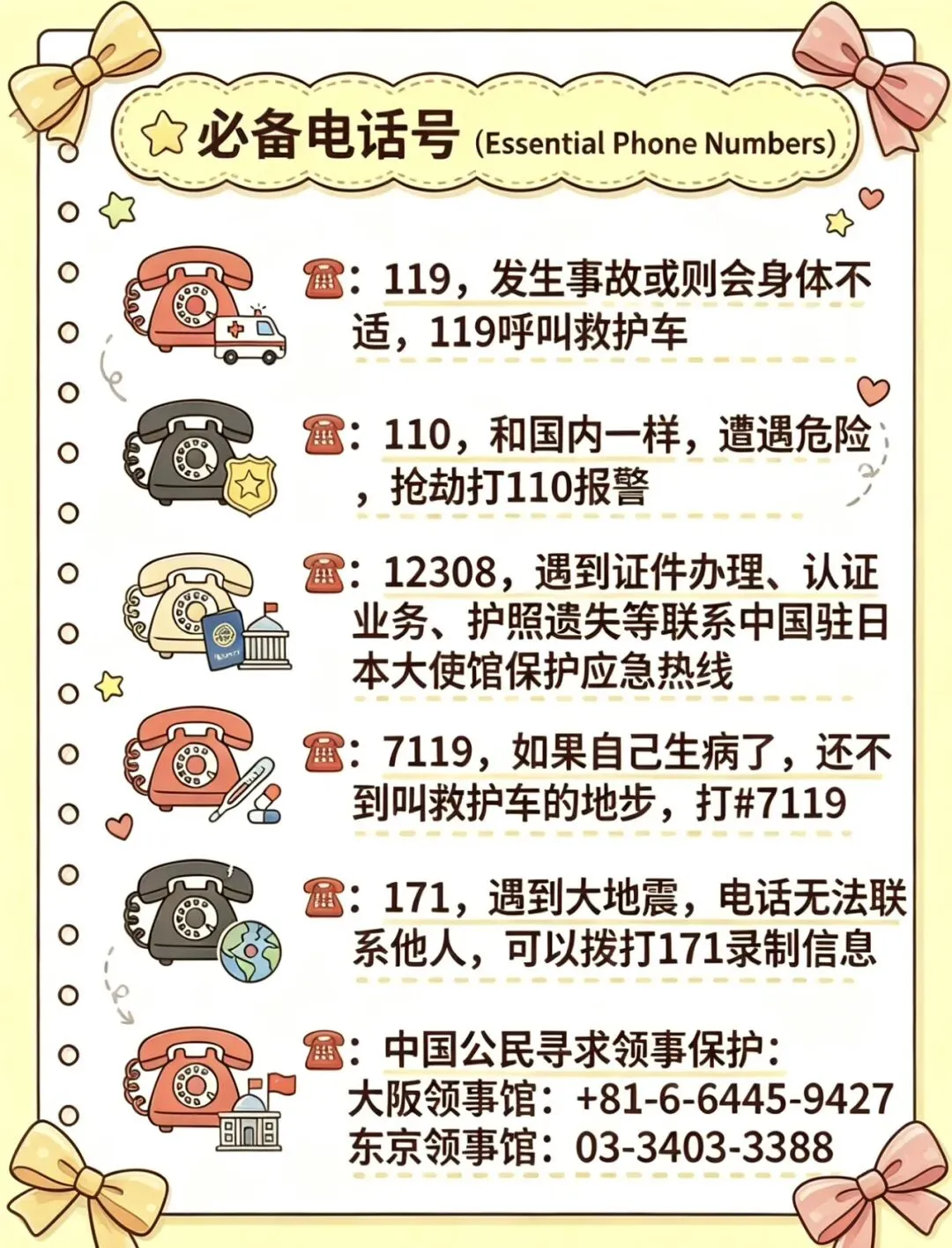 · 119(救护车/火灾)· 110(报警)· #7119(非紧急医疗咨询)· 171(大地震时留言电话)· 中国驻东京领事馆:03-3403-3388· 中国驻大阪领事馆:+81-6-6445-9427· 外交部全球领事保护热线:12308⚠️更悠闲的替代方案:分成两次旅行如果你不想每天早起暴走,可以把这条“东进西出”路线拆成:☝️第一次(5-6天):只玩东京+周边(如镰仓、横滨、箱根)