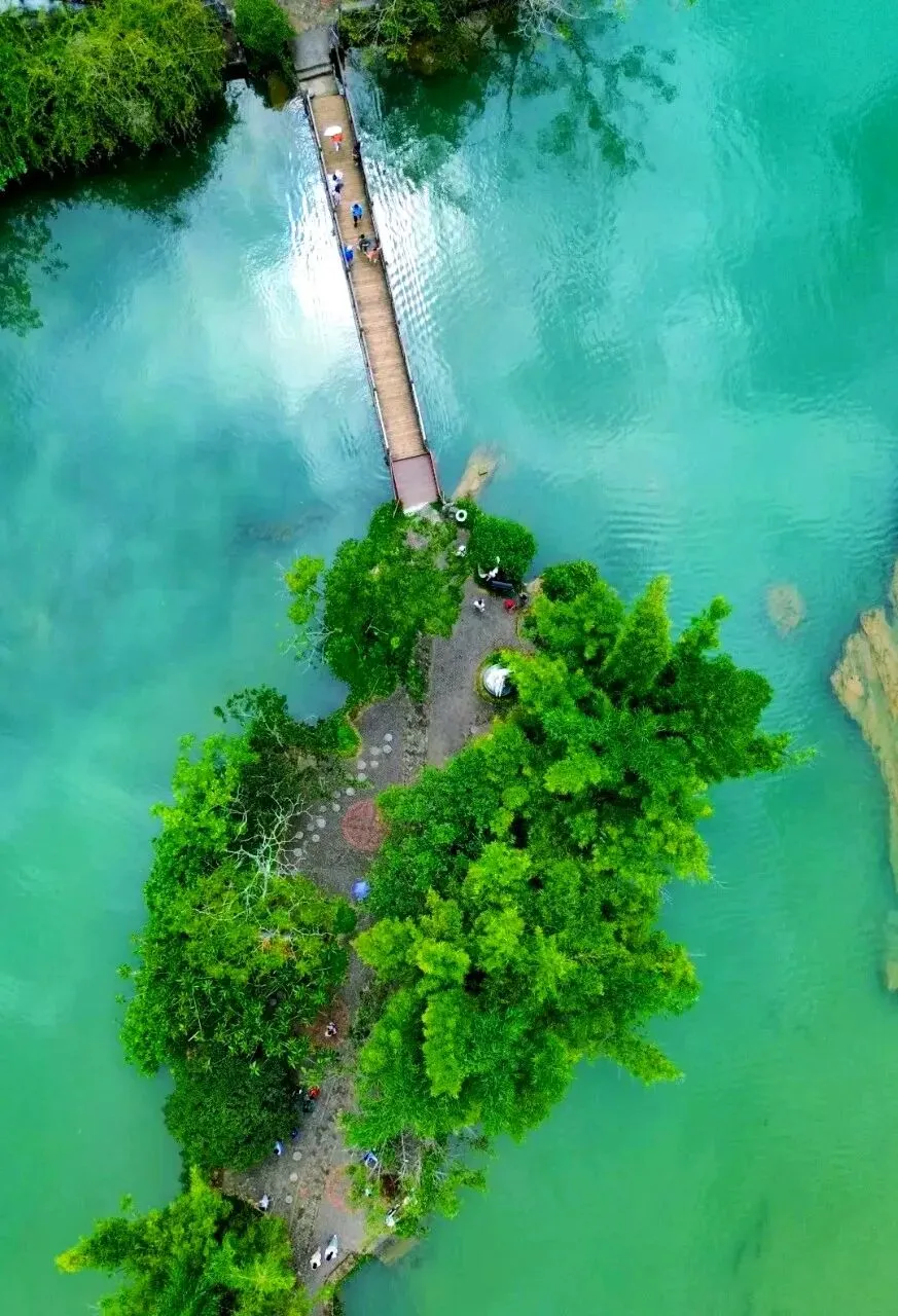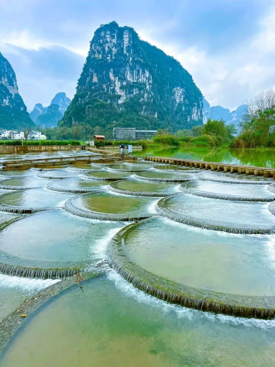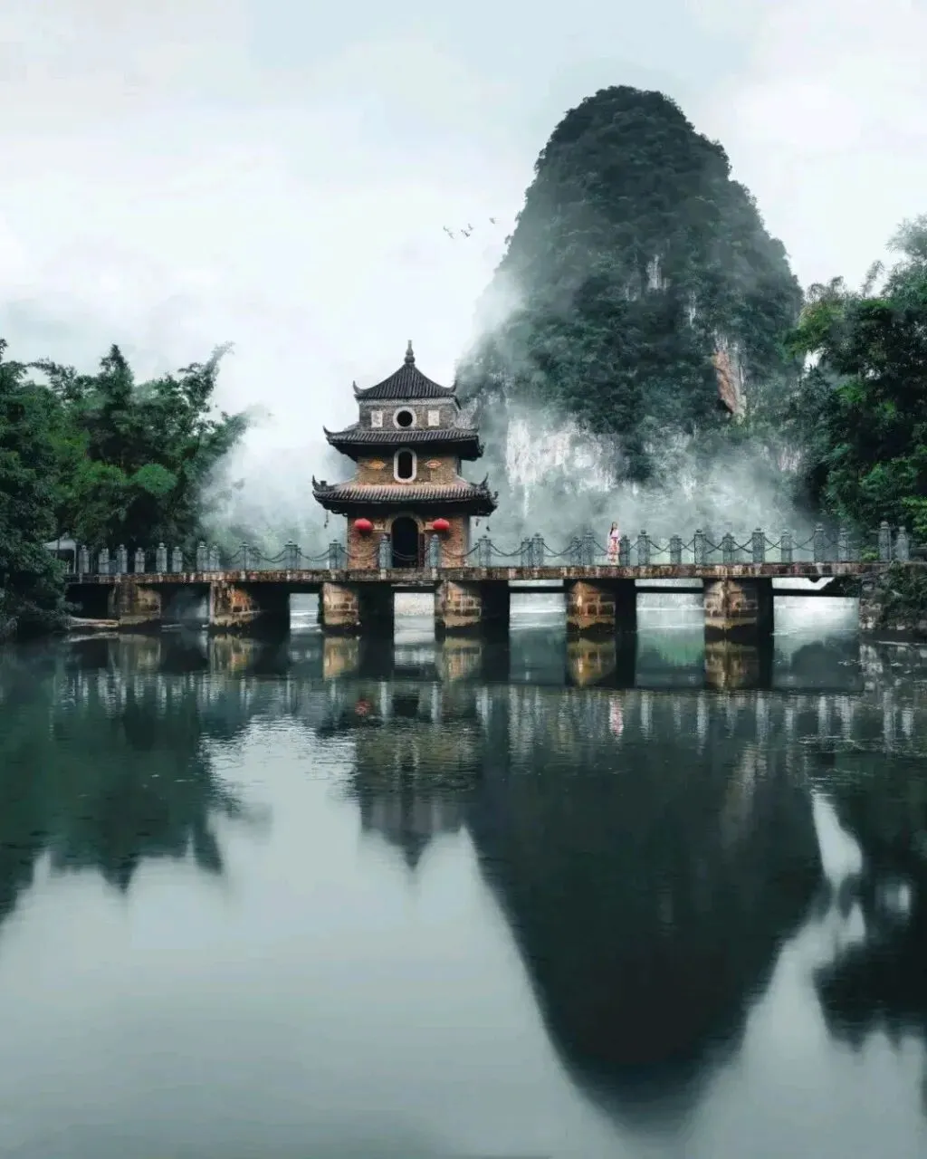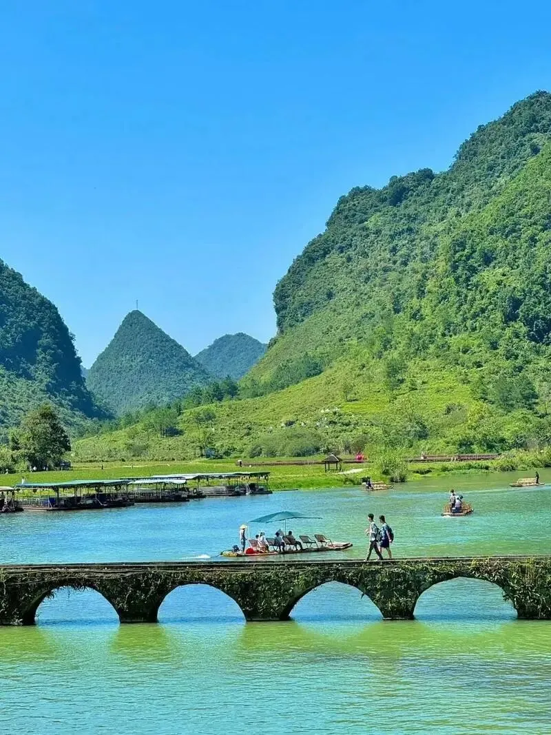 ✅鹅泉:靖西最出片的自然景观之一。一弯碧水如翡翠铺在地上,水车吱呀作响,古桥倒映在水面上——清晨或傍晚光线柔和时,桥洞与倒影形成一个完美的圆。这里是典型的喀斯特田园风光,可以带娃餵鱼、坐竹筏、逛古桥,慢节奏享受山水。