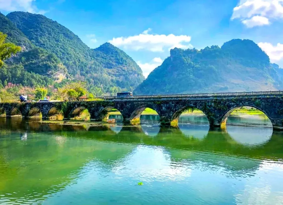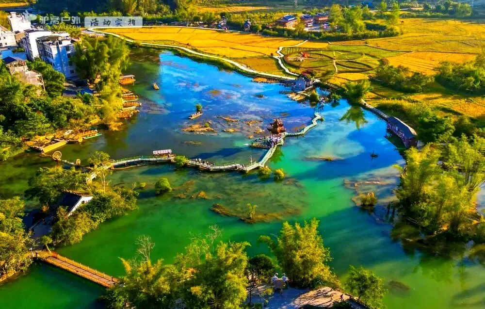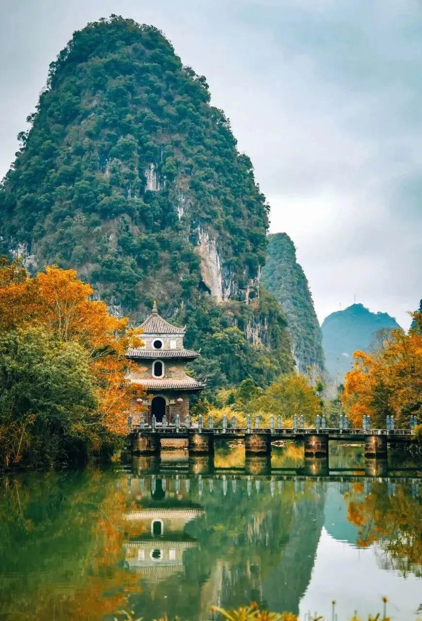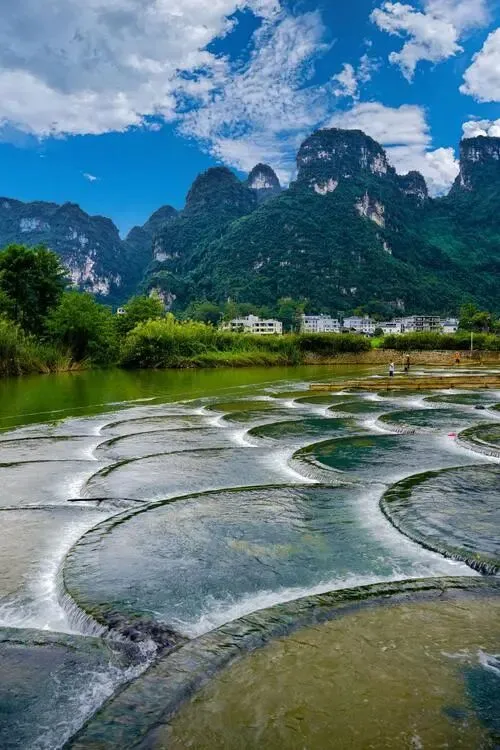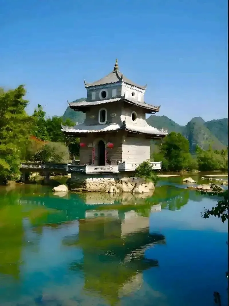 ✅鹅泉:靖西最出片的自然景观之一。一弯碧水如翡翠铺在地上,水车吱呀作响,古桥倒映在水面上——清晨或傍晚光线柔和时,桥洞与倒影形成一个完美的圆。这里是典型的喀斯特田园风光,可以带娃餵鱼、坐竹筏、逛古桥,慢节奏享受山水。
