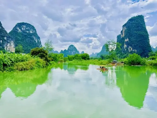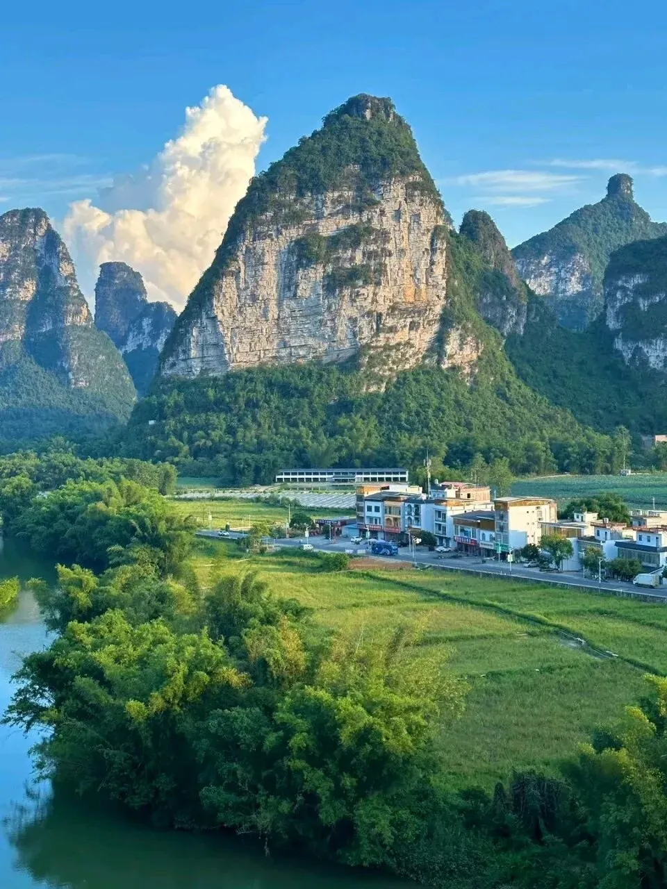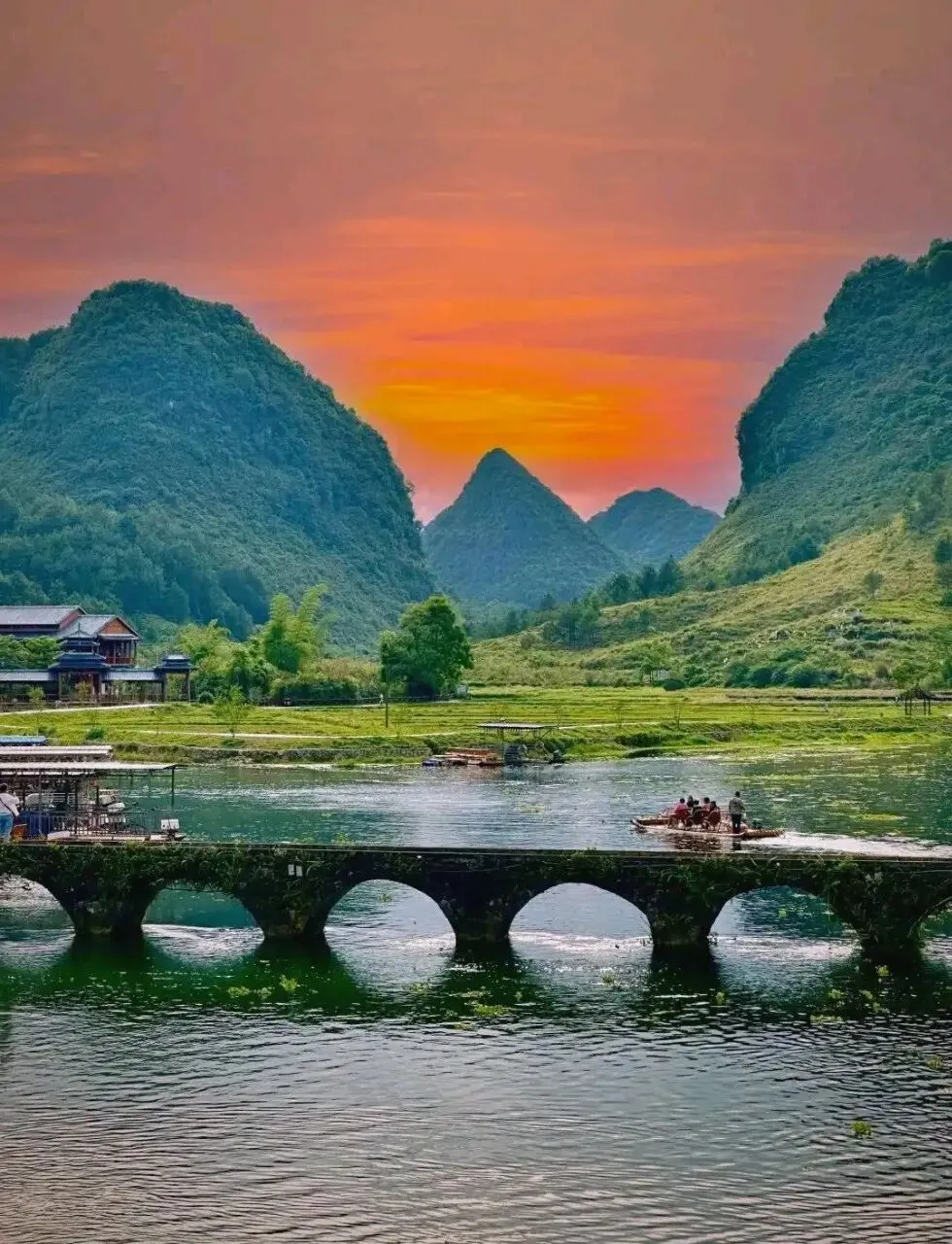 ✅明仕田园:德天瀑布之外的另一重惊喜。这里被称为“小桂林”,翠竹绕岸,农舍点缀,独木桥横跨碧水,远处青山如黛,真正是“人在画中游”。因《花千骨》取景而备受追捧,但依然保持着隐世仙境的静谧。可以租一辆自行车骑行在绿道上,或者乘竹筏顺流而下,感受壮族田园的慢生活。建议下午前往,光影最柔和,拍照绝美。