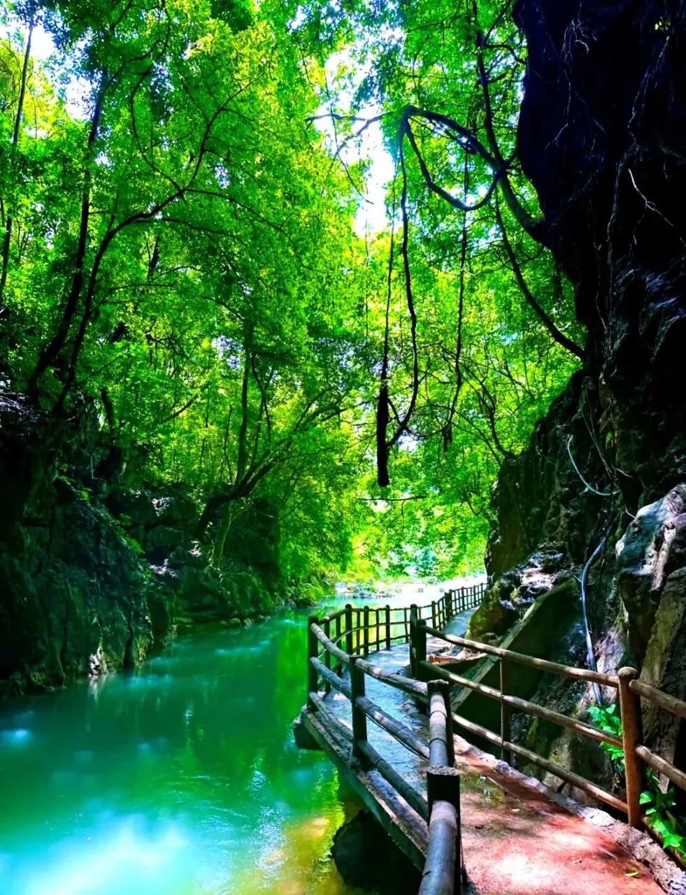 ✅古龙山峡谷群:集峡谷、溶洞、暗河、漂流于一身,128米落差的古龙大瀑布轰鸣而下。最特别的是穿越溶洞的漂流项目,全程平缓不惊险、老少皆宜。徒步路线也设计得十分合理,木质栈道穿梭原始雨林,国家二级保护植物桫椤随处可见,全程不走回头路。