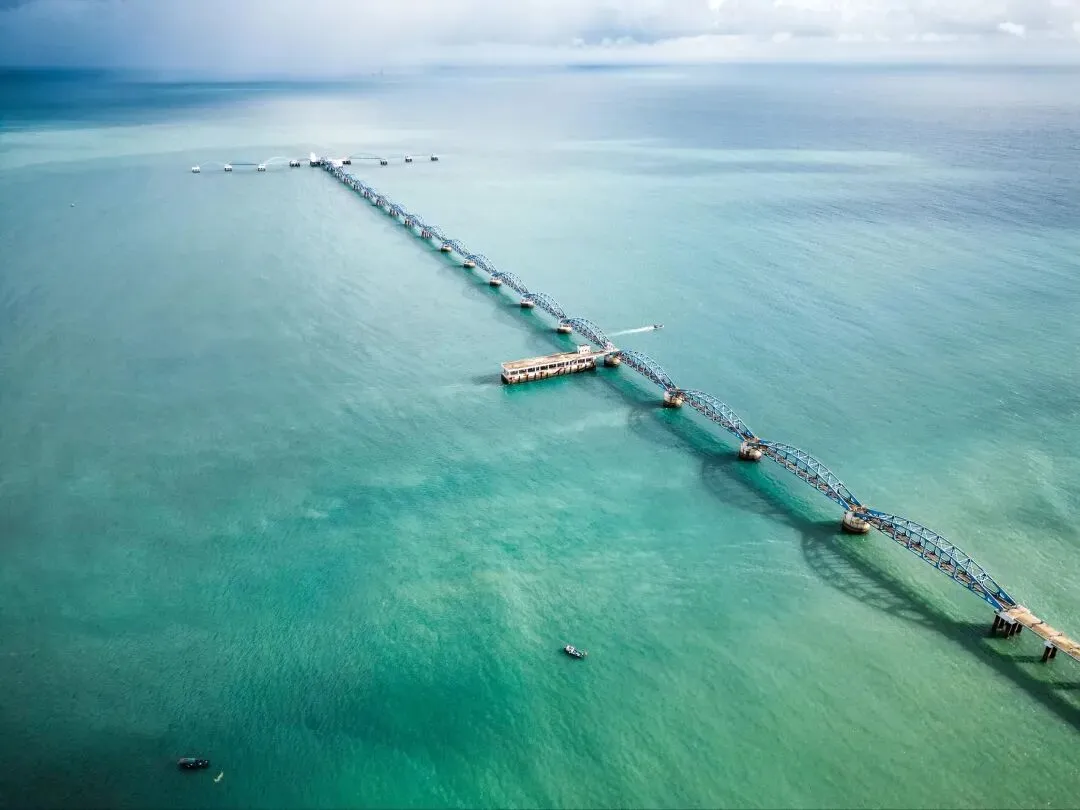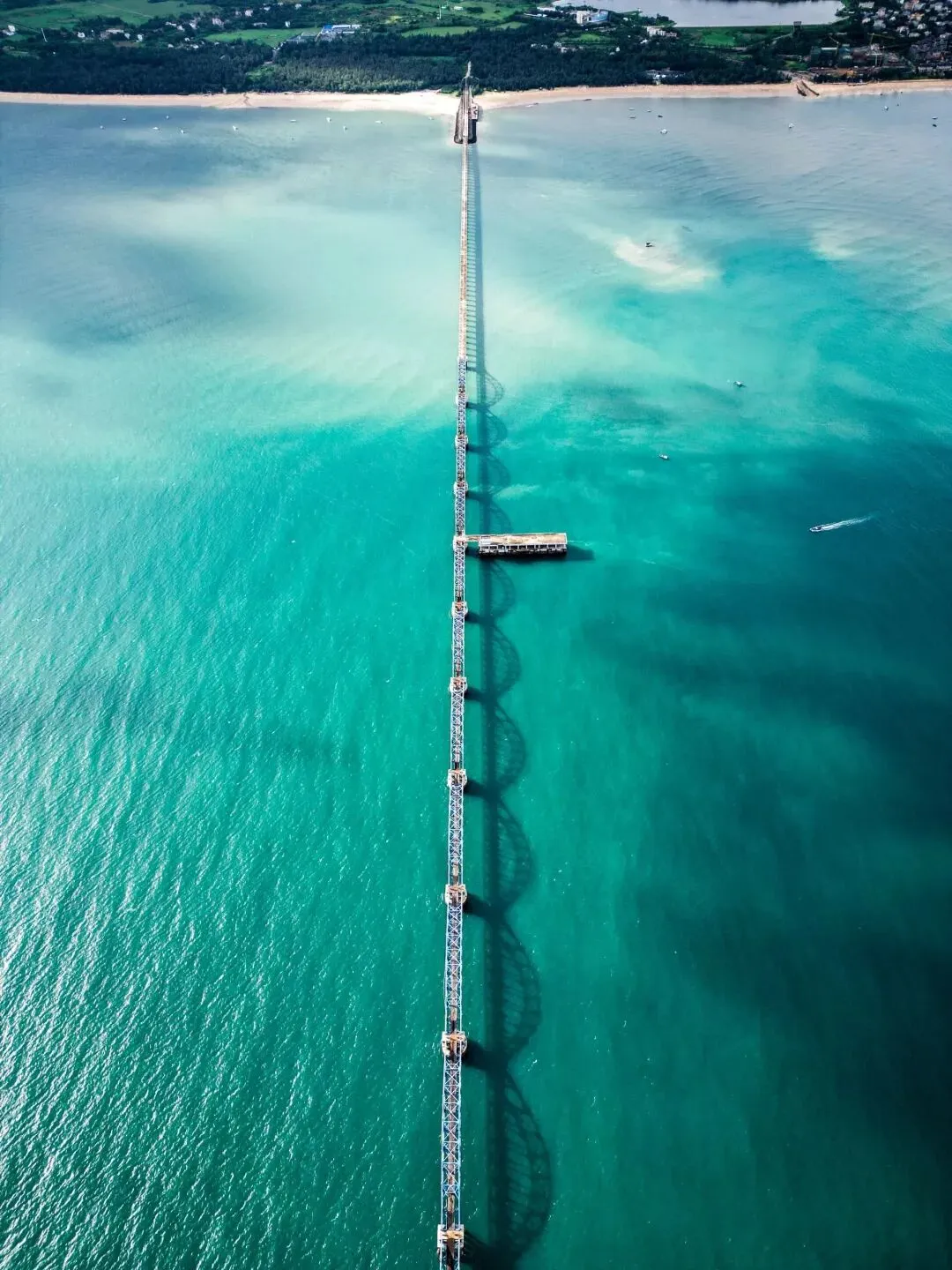 ✅蓝桥:网红打卡地,一座废弃的蓝色跨海栈桥,延伸向大海深处,航拍视角绝美。