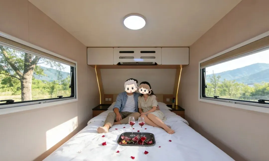 情侣房车打造私密温馨小天地,简约精致的内饰,柔软舒适的床铺,沿途风景作伴,远离城市喧嚣。