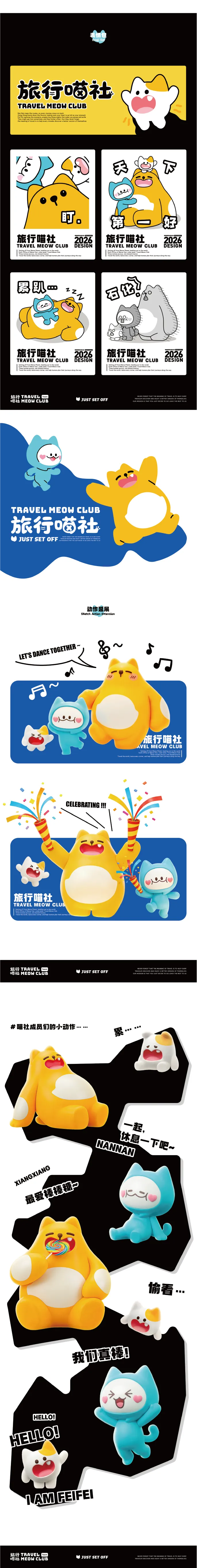 「旅行喵社」这组IP真的太懂懒人旅行的爽感了!三只小猫各有分工,造型也完全踩中了软萌治愈的点。南南是清爽蓝白的靠谱社长;享享是圆滚滚的暖黄吃货;飞飞则是白黄配色的机灵小不点,看着就古灵精怪。整体都是圆润软乎乎的造型,看着就很舒服,把“攻略交给我们,你只管出发”的松弛感直接拉满,亲切感超强。