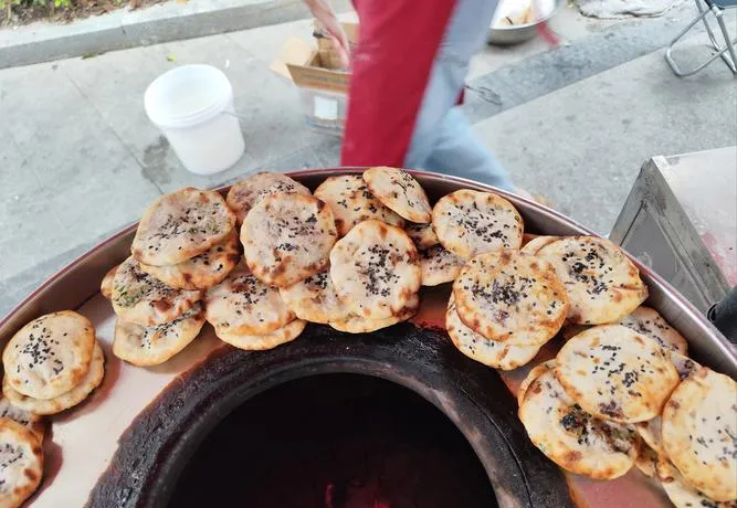 开化的小吃也藏着一套自己的逻辑,不是为了做成连锁品牌,也不是为了吸引游客,就是本地人每天都在吃的东西,但认真程度一点不含糊。龙潭烧饼开在街边拐角,小小一个店,没什么环境可言,也没有堂食,但门口等的人一波接一波,都是常客。小烧饼两块钱一个,分霉干菜和小葱肉两种口味,辣度恰到好处,不像衢州烧饼那么冲,是一种香辣。
