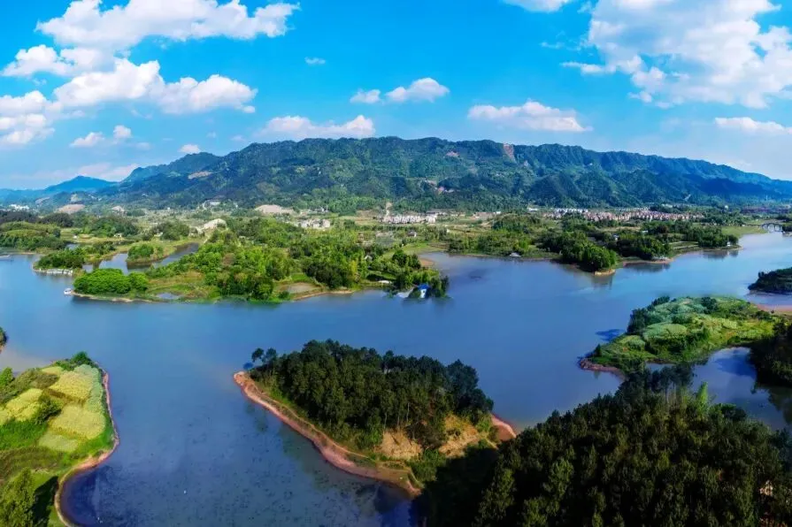 龙水湖旅游度假区位于大足区东南部、巴岳山西侧山麓,坐拥玉龙山国家级森林公园、龙水湖国家级水利风景区、国家五星级温泉等国家级生态资源。“山湖泉岛村”构建了度假区绝美的生态画卷。