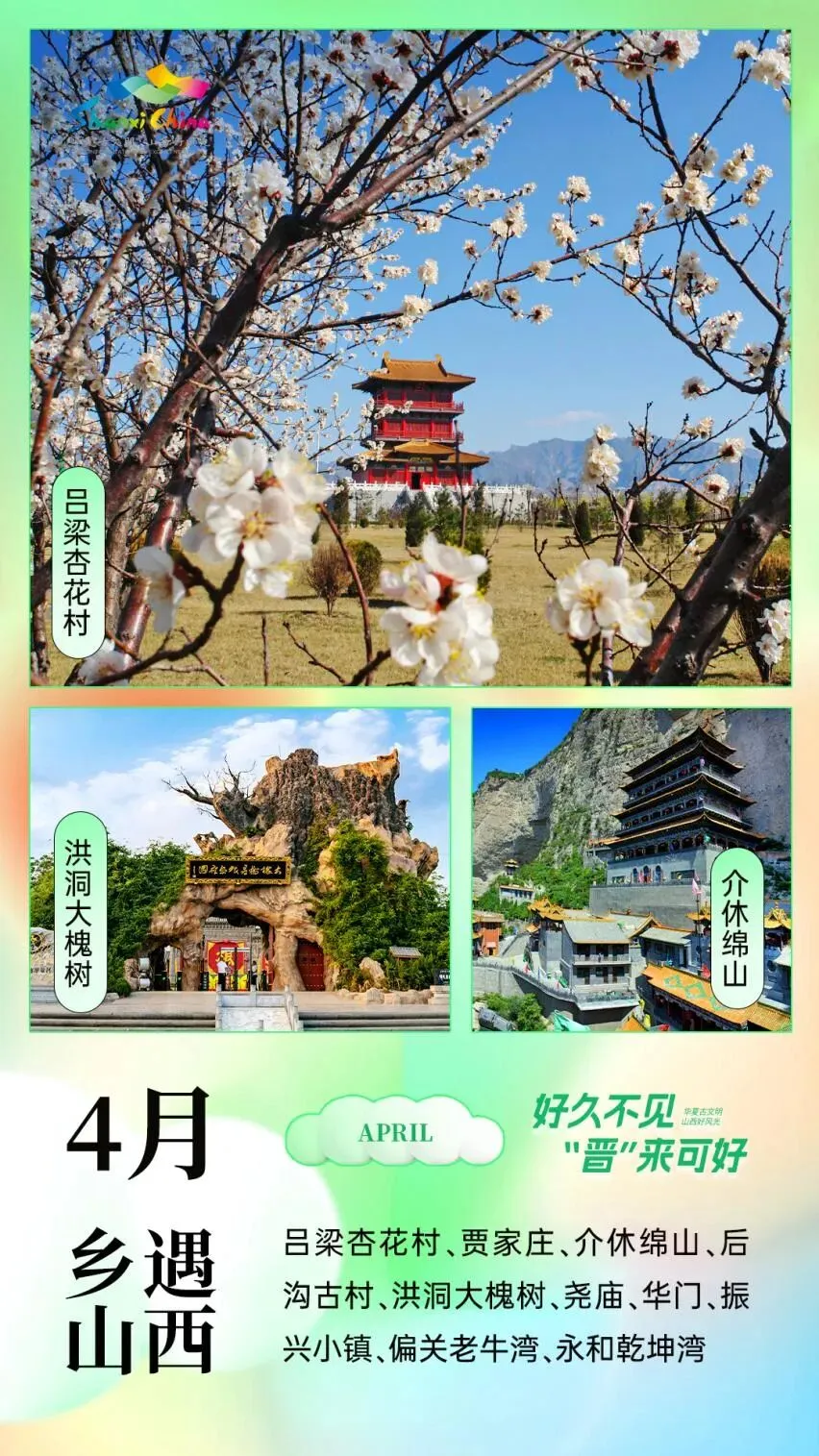 四月的第一站当然要去中国清明节发源地介休绵山,宛若画中人,游走于山水古迹中;“借问酒家何处有?牧童遥指杏花村”,到底是怎样的酒才能让杜牧写下这千古名诗,在传说中的杏花村找到答案。“谷雨时节农事忙”,走进乡村看全新风貌,汾阳贾家庄,榆次后沟古村和长治振兴村是劳动人民的双手创造财富完成华丽转型的典型代表。