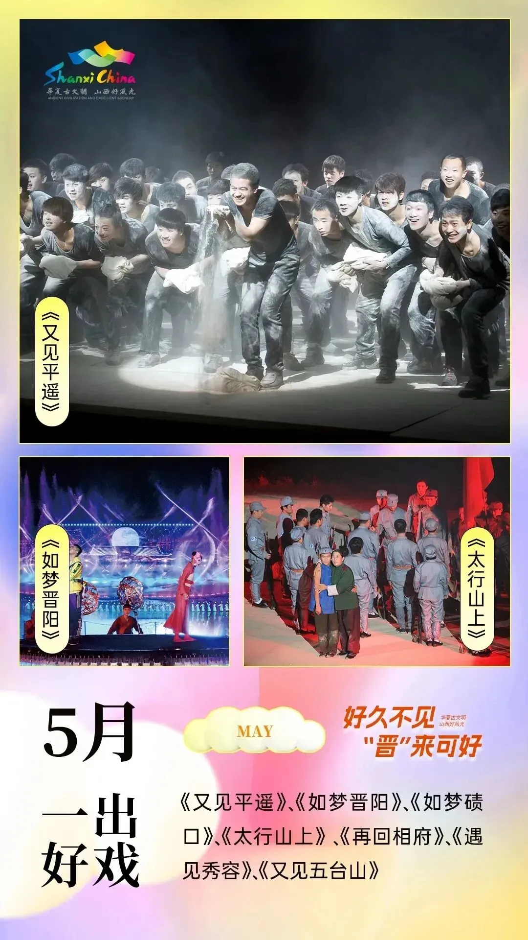 五月千万别错过这些好戏!《又见平遥》带你实景穿越,身临其境;《如梦晋阳》如梦似幻,探寻晋阳文化;《如梦碛口》重现古镇繁华,领略黄河风情;《又见五台山》带你开启一趟心灵之旅;《再回相府》让皇城相府的故事永久延续永不落幕。