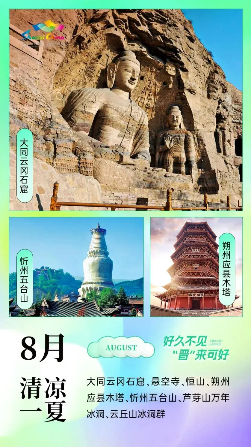 八月避暑胜地来北岳恒山就对了,悬空寺在绝壁上的绝妙设计让你不禁赞叹,再搭配一碗浑源凉粉下肚绝对暑气减半;“清凉胜境”五台山,像是大自然留给你的最后一片净土;忻州芦芽山的绿荫山林中梦回《暮光之城》;万年奇迹云丘山冰洞给你夏日冰爽体验;太行山八泉峡,将夏天的燥热都屏蔽在峡谷外。