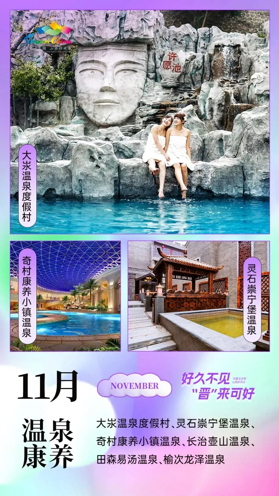 十一月,泡个“安逸”的温泉吧!泡温泉绝对是入冬必备项目。稀有的“高温医疗氡泉”大汖温泉、坐落在王家大院里的古堡式温泉酒店崇宁堡温泉、被誉为“世界四大温泉之一”的奇村康养小镇温泉、与自然融为一体的长治壶山温泉,静卧其中,卸下平日的疲惫,感受放松身心带来的愉悦。