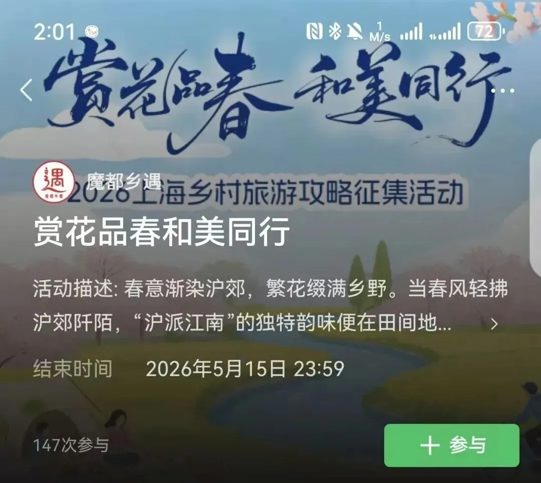春光大好,别浪费!“赏花品春,和美同行”——2026上海乡村旅游攻略征集活动,还在火热进行中!截至今日已收到100多份春日来信。透过这些投稿,我们看见了上海乡村的万千模样:郊野公园里,花海正盛;乡村民宿中,烟火可亲;骑行路上,田园风光掠过眼底;露营草地间,欢声笑语随风而起。