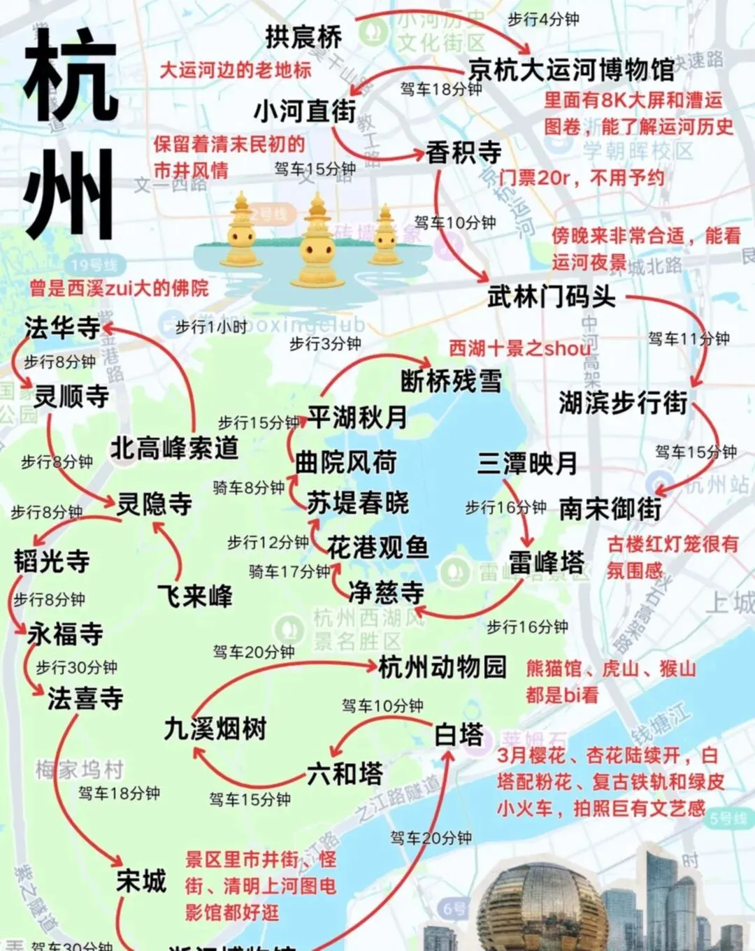 3️⃣大运河慢游:摇橹船+逛老街,大兜路吃地道小吃,感受烟火杭州~🍢 📌灵隐寺/飞来峰需提前预约,穿运动鞋更舒适!