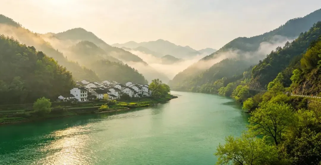 富春江的春水,碧绿碧绿的,青山一座接着一座, 白墙黑瓦藏在云雾里面,就好像一幅慢慢展开的水墨画,
