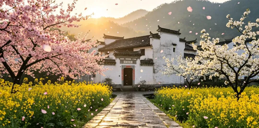 春天的歙县, 桃花,梨花,油菜花一层一层地互相叠着,开在徽州古村落房子前后,石板路湿湿乎乎而且干干净净的,老房子安安静静地立着,时间好像都慢下来。