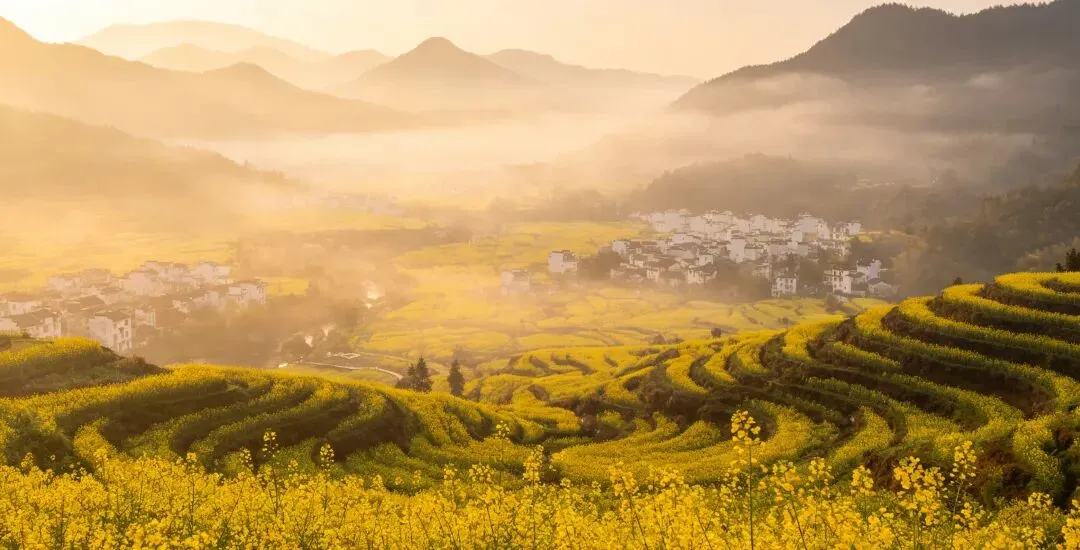 白墙黑瓦和金黄的油菜花互相衬托,梯田一层接着一层,山间云雾缭绕, 随便拍一张都像壁纸一样好看的画面,