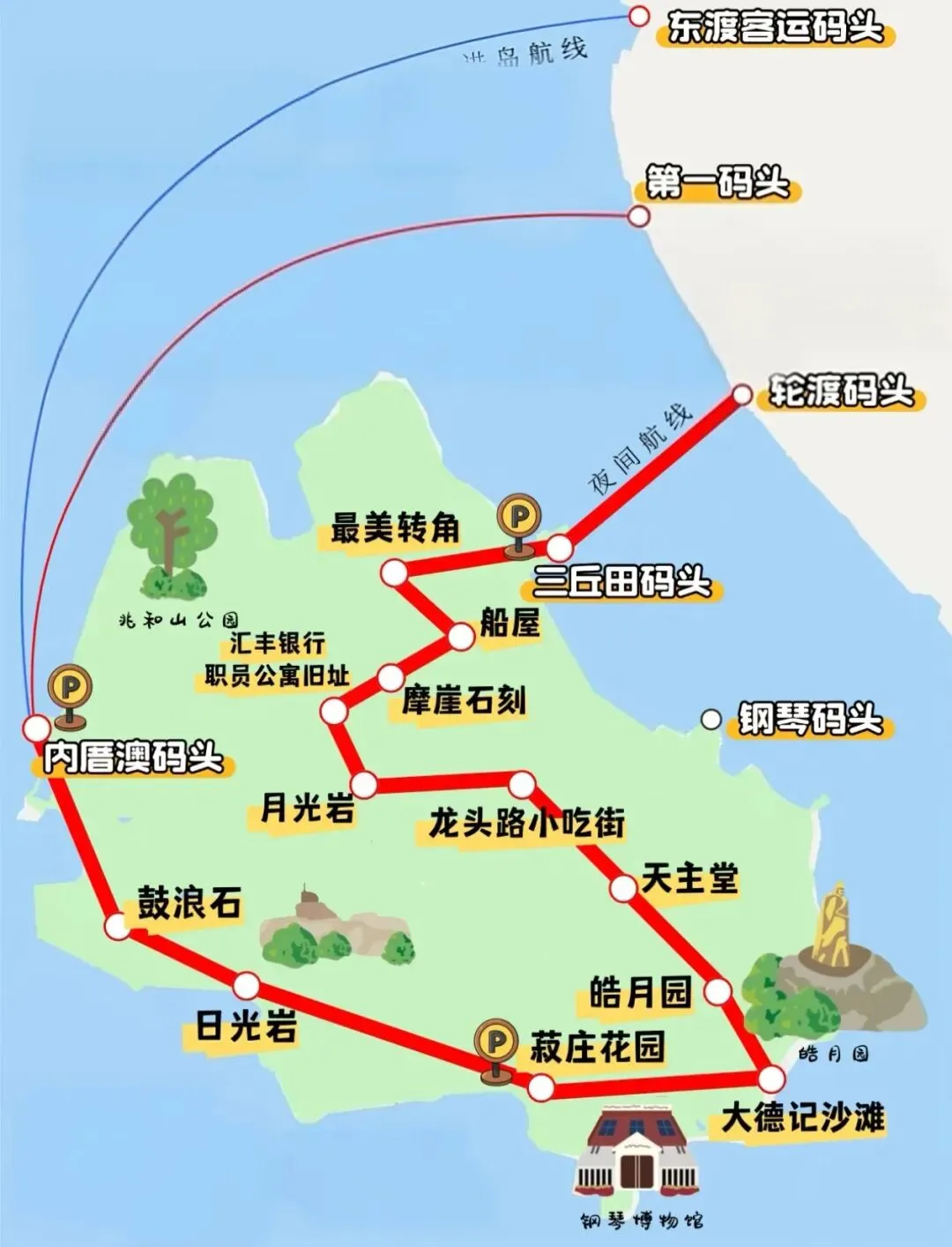 游玩路线:内厝澳码头→鼓浪石→日光岩→淑庄花园→大德记沙滩→皓月园→天主堂→龙头路小吃街→月光岩→汇丰银行职员公寓旧址→摩崖石刻船屋→最美转角→三丘田