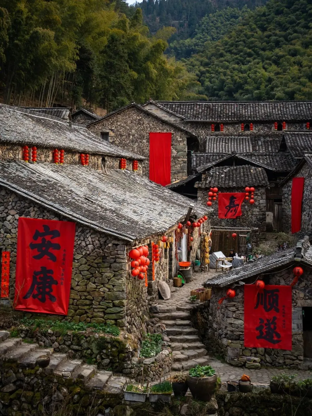 这是一个完全用石头筑起来的百年古村,坐落在括苍山脉的山谷之中,房子是石头垒的,路面是石头铺的,围墙、台阶甚至就连村里的水缸都是石头凿的,保留着完整的浙南山村原生样貌。村子被竹海青山环抱,春天溪水涨起来,顺着村头的石拱桥流过,坐在石头院子里晒晒太阳,喝一杯本地山茶,连呼吸都带着山野的清冽气,是被很多摄影师私藏的小众古村。