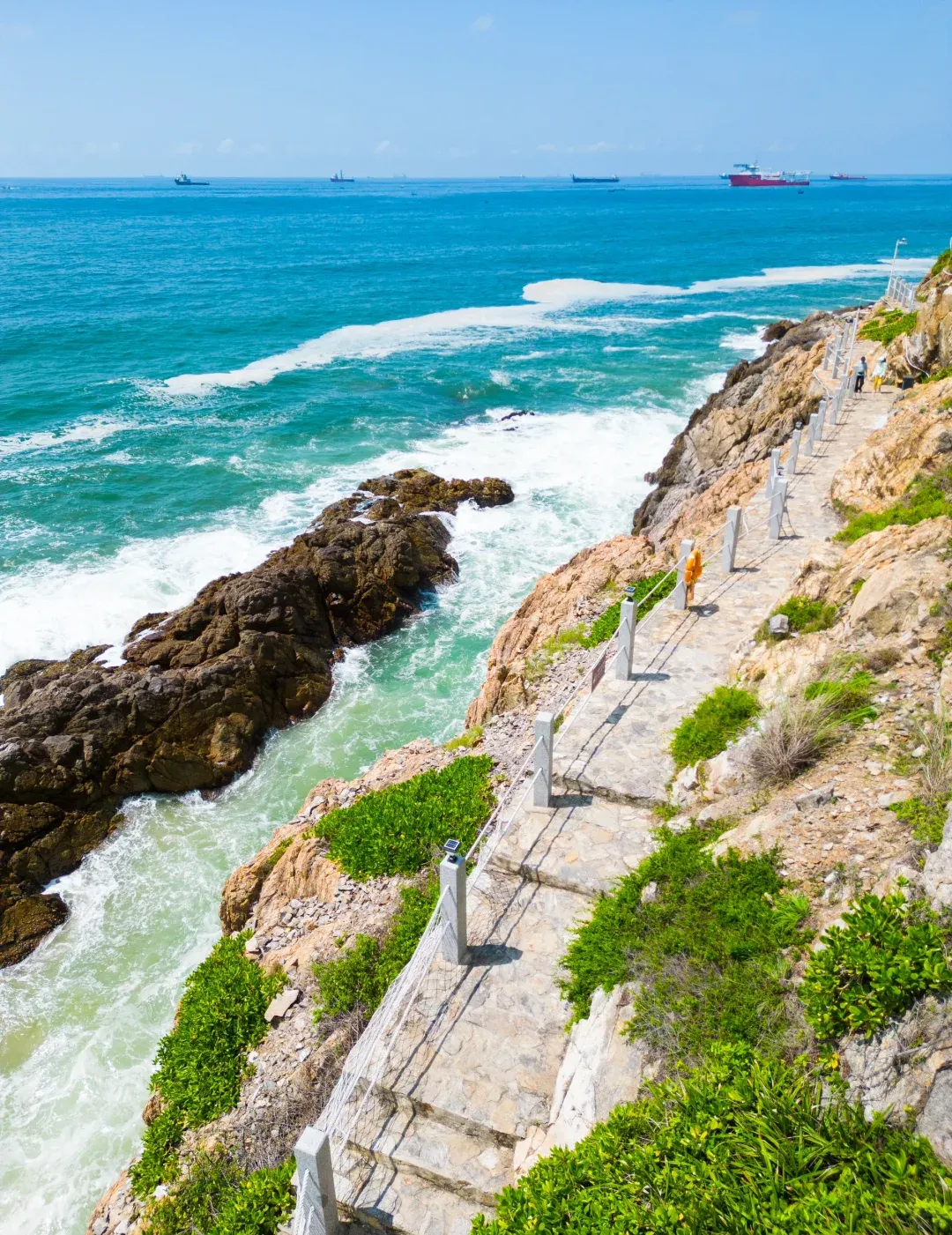 超级出片的海边礁石栈道,便是坐落于此,你可以沿着栈道,一步步走向大海,看浪涛拍打在身旁的礁石上,激起洁白的泡沫,格外地震撼人心。