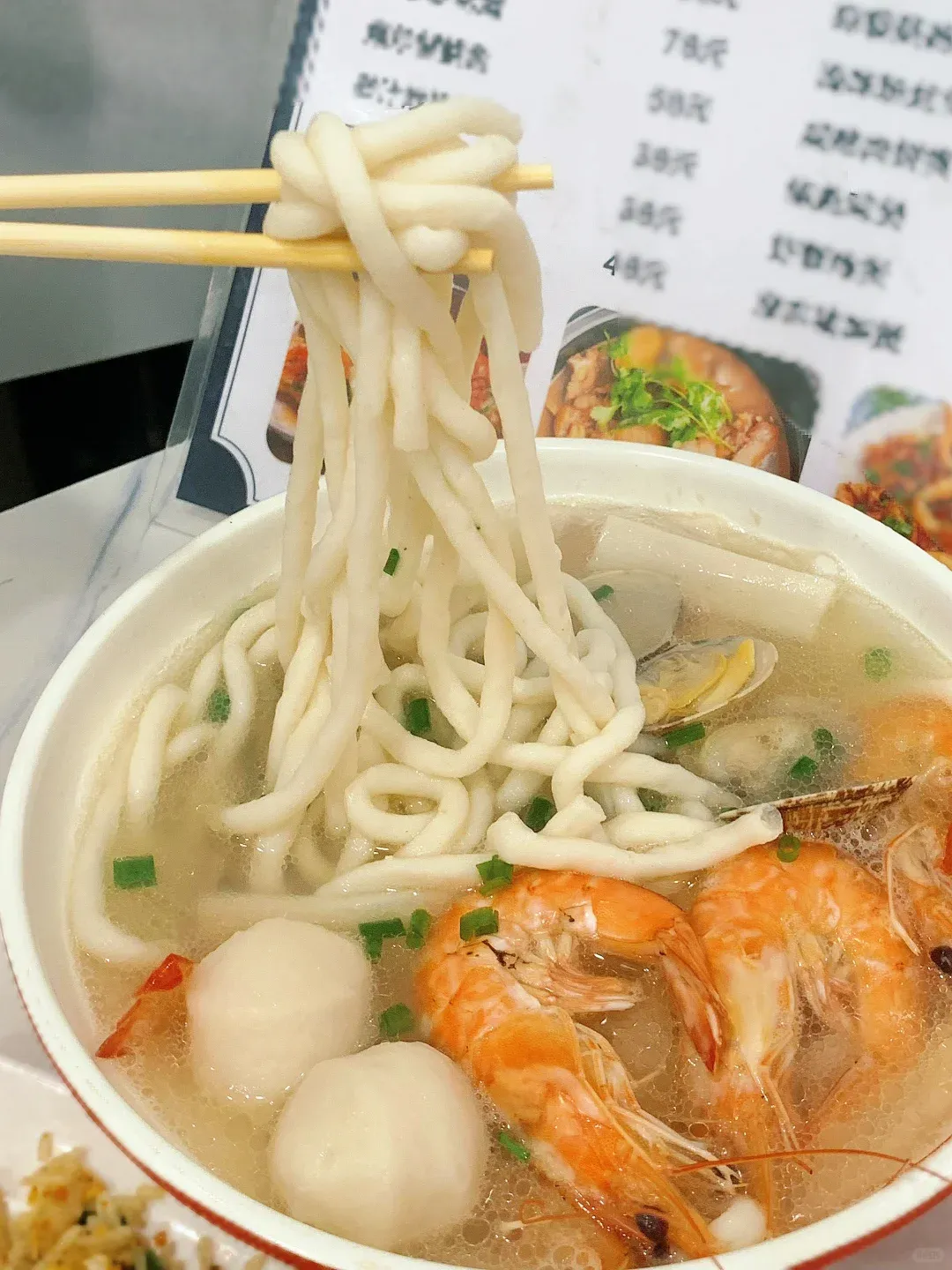 当地人会将鱼面煮着吃,还会堆上满满当当的小海鲜,Q弹的大虾,韧劲的鱼丸,鲜嫩的蛤蜊……嗦上一口,大海的鲜美就在口中翻滚。