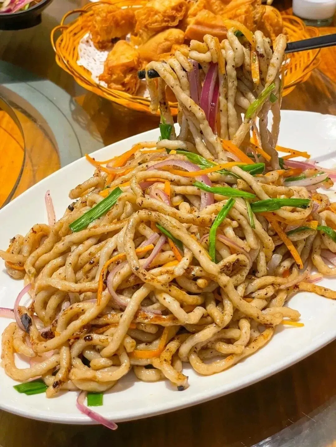 鱼面也可以炒着吃,最有名的便是三丝炒鱼面,配上红青椒丝,或是胡萝卜丝,洋葱丝,炒好的鱼面酱香浓郁,一口下去,那叫一个软,甜,爽,滑。