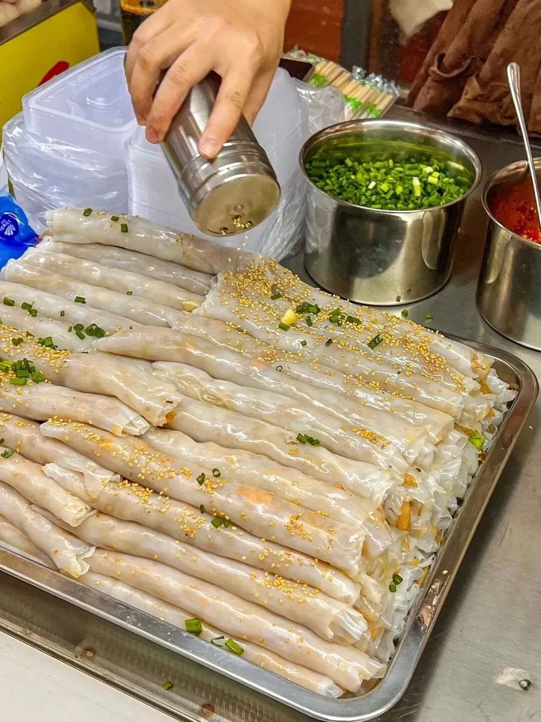 外面的皮子微凉软韧,内里的馅料爽脆可口,再撒上芝麻,抹上阳江特有的辣椒酱,咸中带香,鲜辣过瘾!