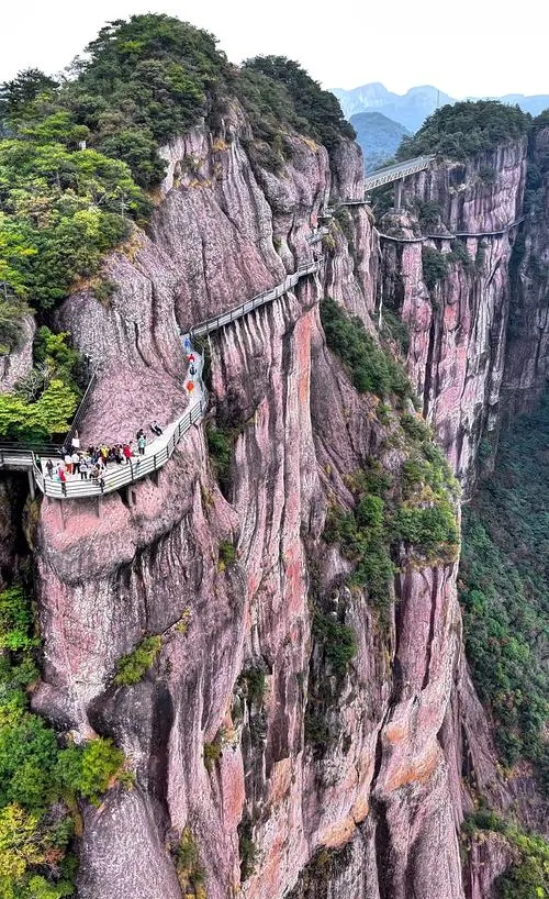 这座山最厉害的地方,不是它有多高,是它让你明白,什么叫真正的地质奇观。那些火山岩形成的柱状节理,一根根笔直竖起来,像是被巨人用刀削出来的,这种景象在浙江其他地方根本看不到。你走在悬崖栈道上,脚下是几百米的深渊,头顶是直插云霄的石柱,那一刻你会感觉到,浙江这个地方不全是温婉的,它也有狂野的一面,只是平时被藏起来了。