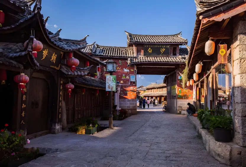 第三站:白沙古镇——纳西族的原始部落这才是丽江最早的聚居地,木氏土司的发祥地。最绝的是白沙壁画,融合了汉、藏、纳西文化,明代的宗教画卷色彩依然艳丽。古镇街头全是穿着羊皮披肩的纳西阿奶,您可以花10块钱买个现烤的粑粑,边吃边看远处的雪山。游玩策略: 每周五的赶集日必去,野生菌、纳西刺绣便宜又好,别忘了砍价。